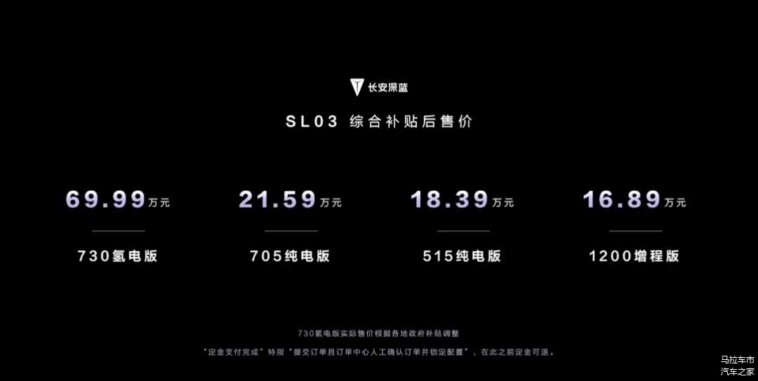 据了解,此次长安深蓝SL03共推出纯电版、增程版、氢电版三种能源形式、4款配置版本的车型,并将提供包含哑光车漆、多种内饰CMF、运动轮毂、高阶智能驾驶辅助服务等个性化选装来满足用户的多样化需求,新车综合补贴后的售价为16.89-69.99万元。