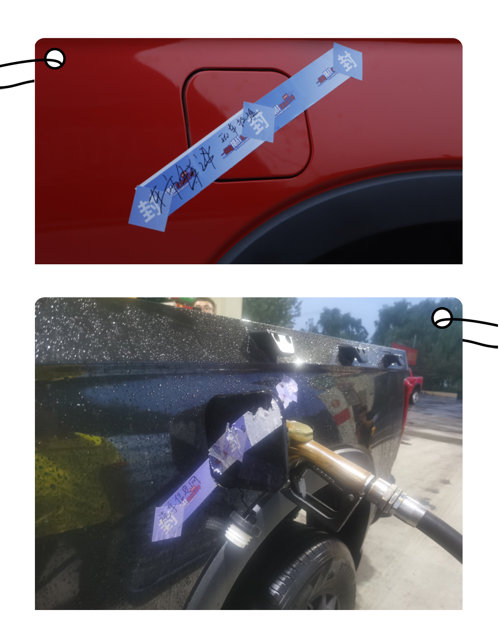 出发前,测试车辆加满油并且在现场媒体和车主代表的见证下,将油箱盖贴上封条并签字标记,杜绝沿途补充燃油。