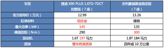 捷途X90 PLUS搭载的鲲鹏动力1.6T发动机采用铝合金作为缸体材料,相较吉利豪越的铸铁发动机而言重量更轻、散热更快,而且应用了i-HEC 智效燃烧系统、快速升温的热管理系统、快速响应的增压技术、降摩擦技术等多重先进技术,热效率高达37.1%,这也就意味着捷途X90 PLUS的汽油燃烧更充分,释放的能量更多,自然也就更省油。捷途X90 PLUS不仅在动力方面给到用户满足,还提供全系车型整车终身质保,为向往更高品质生活的用户提供了一个新的选择!