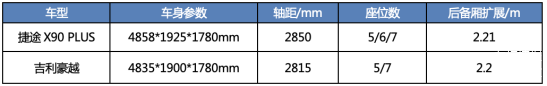 对于在空间方面有着硬需求的二胎三胎等多人口的用户家庭来说,没有什么比更大的车身尺寸更有诱惑力,与捷途X90 PLUS相比,吉利豪越除了车身高度打平之外,其他参数都略逊一筹,不如捷途X90 PLUS大气。