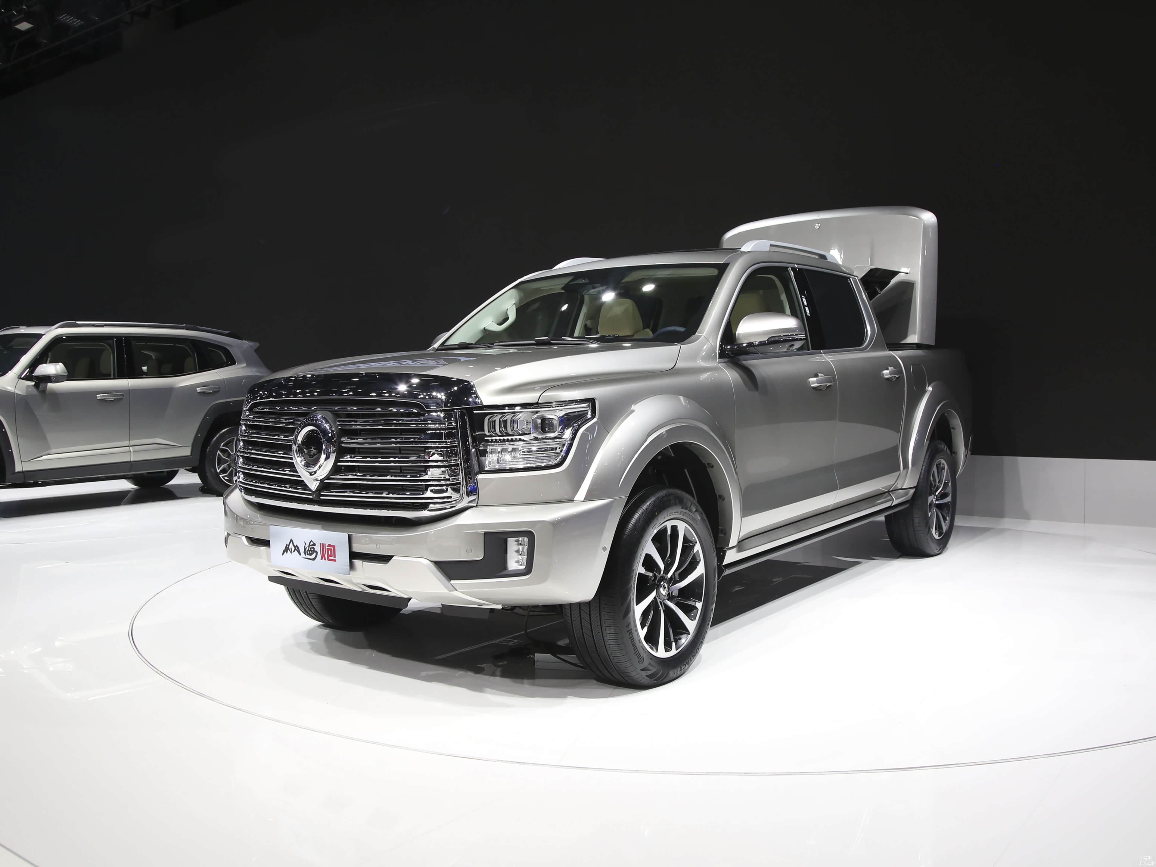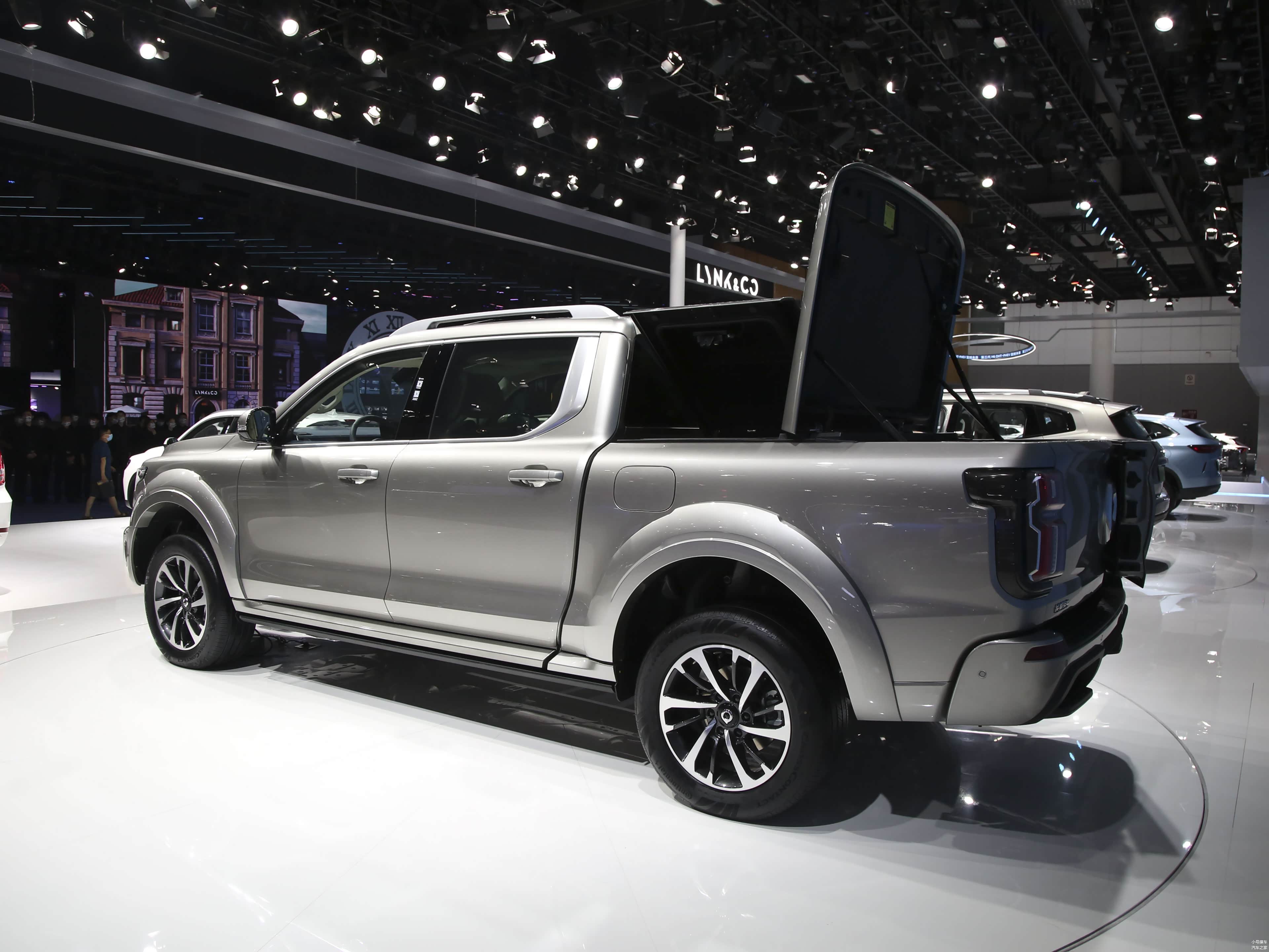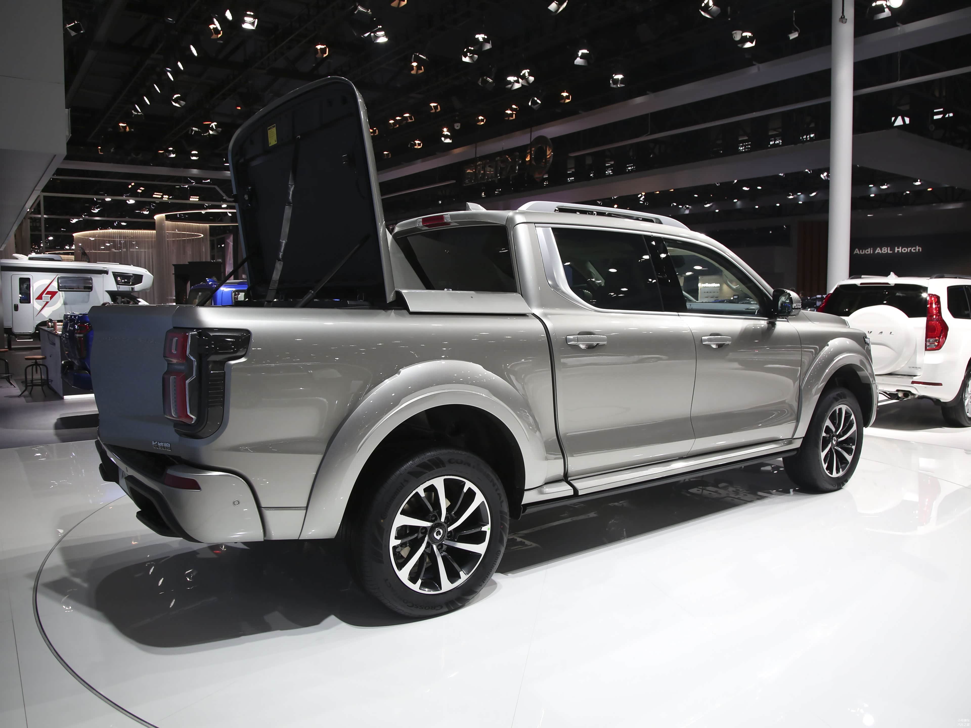 尾部造型方面,熏黑的尾灯组采用了垂直布局,下包围部分的造型比较激进,营造出了双边共两出排气装饰罩造型,而且起到了登车梯的作用。货箱还配备有顶盖,支持多种开启方式。
