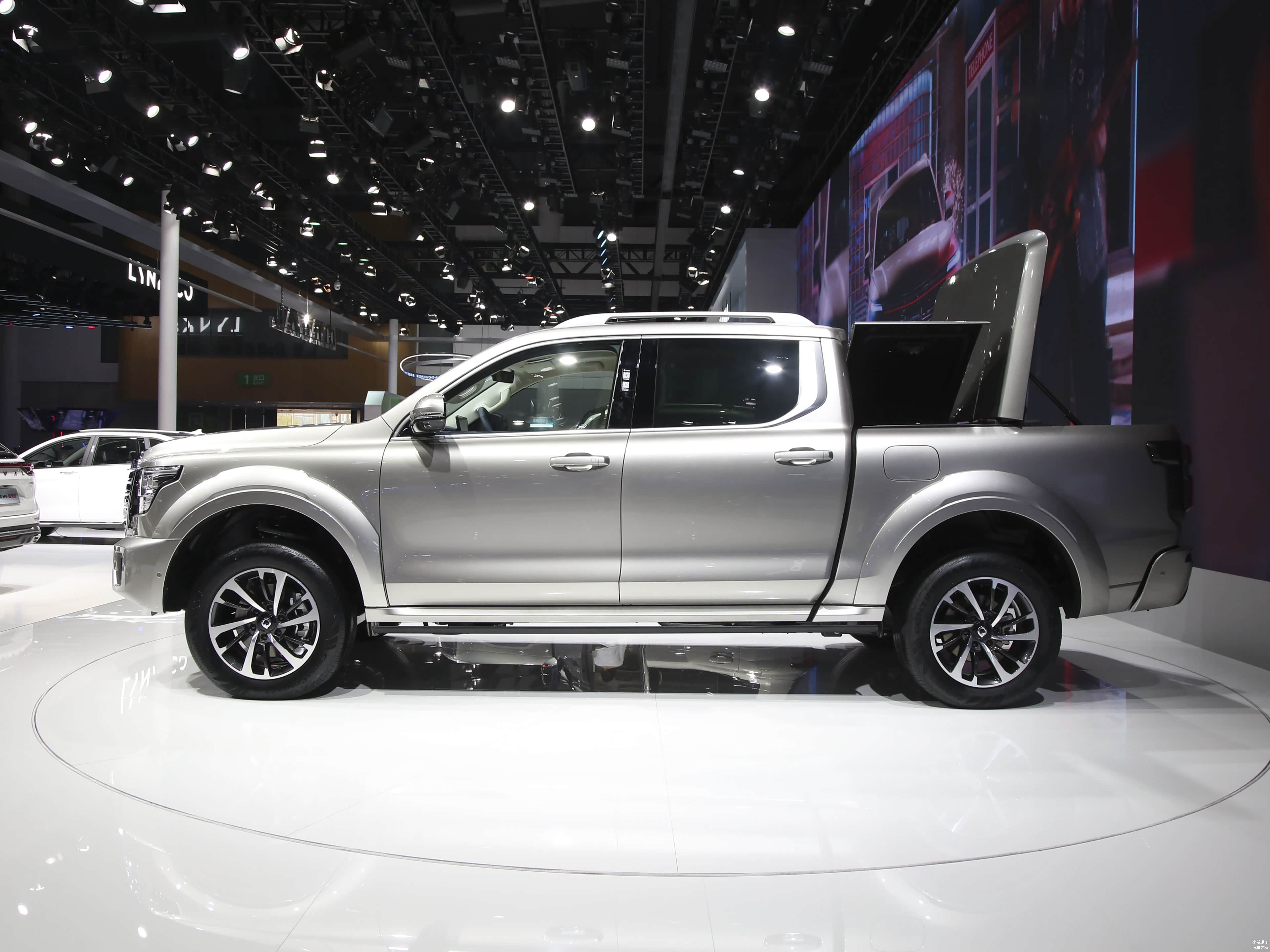 侧面造型方面,新车采用的是经典的双排皮卡设计,车顶线条比较平直,行李架也没有缺席;腰线采用了贯穿式谁,让视觉效果显得修长大气;轮眉和侧裙部分的造型都比较粗壮,进一步增强了力量感表现;轮毂采用了的双五辐式刀锋造型,很有运动气息;而且轮拱的尺寸比较大,为后期升级越野胎预留了空间。