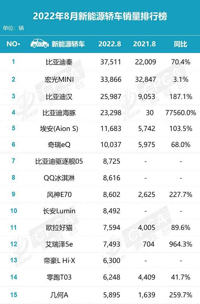 除了上述3款车型外,排在新能源轿车榜第四位的是比亚迪海豚,月销量23298台,第五位则是埃安S,第6-10位分别是奇瑞eQ、比亚迪驱逐舰05、QQ冰淇淋、风神E70以及长安Lumin等车型。