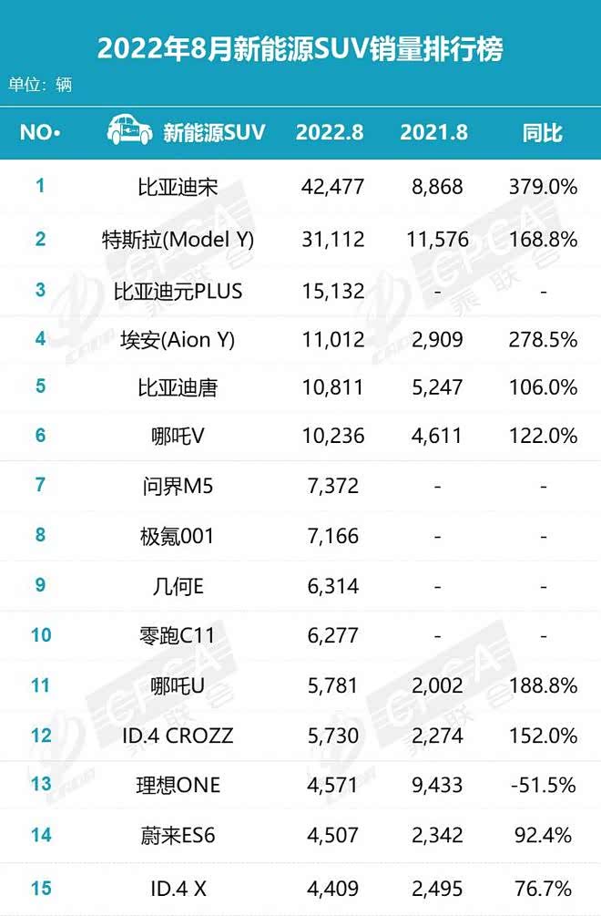 除了上述三款车型外,广汽AION Y排在了第四位,在8月份同样实现了月销破万,比亚迪唐位居第五,月销10811辆。此外,哪吒V、问界M5\极氪001、几何E、零跑C11分列第6-10位。