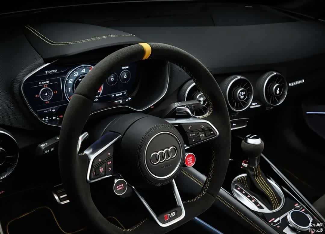 把视线转向到内饰,奥迪TT RS iconic版整体的内饰功能布局与此前的并无太大的区别,比如大尺寸液晶仪表、中控台的三个圆形飞机涡轮空调出风口等依然是TT系列熟悉的风格。内饰最大的区别则来自于带有RS标识的D型三辐式多功能方向盘,以及集成于方向盘的drive select键和点火启动键。