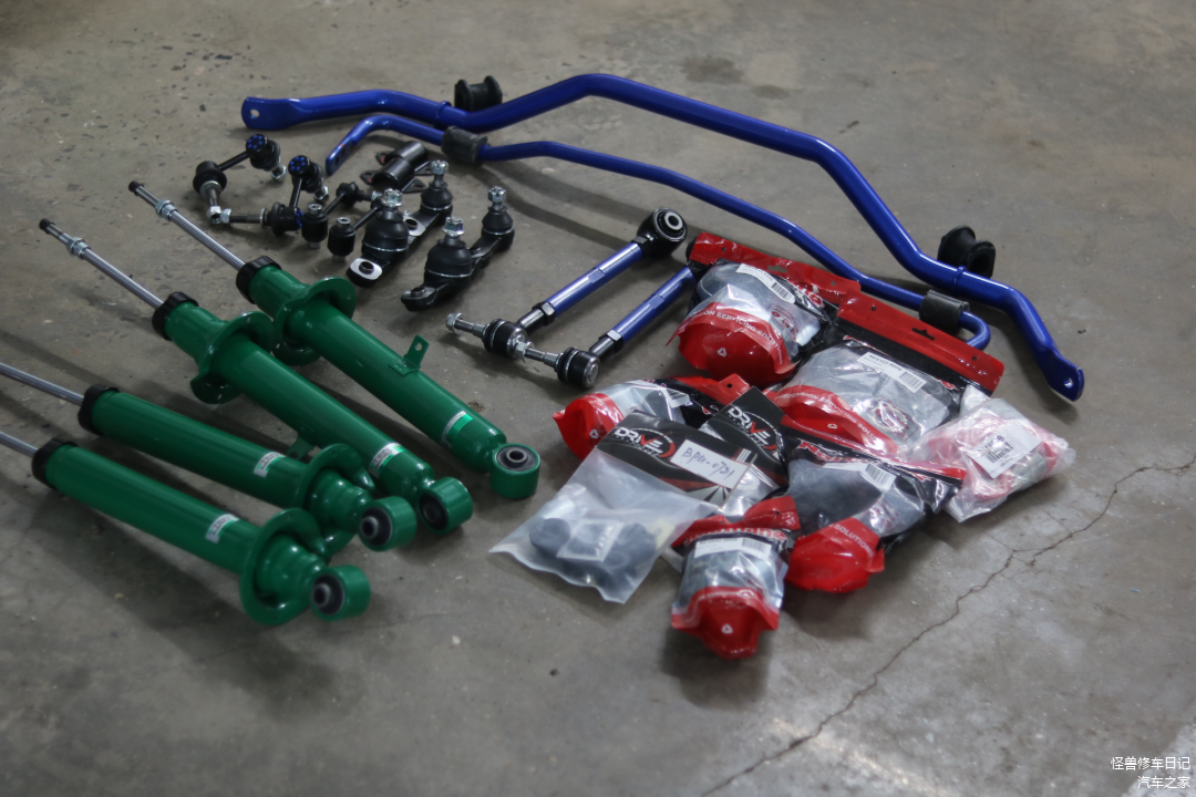 开搞底盘系统,因为这车改过的动力还不错,车主就想追求一点激情驾驶性能,所以咱们对整个底盘系统做全面升级改装,升级一套日本TEIN避震器+升级聚氨酯强化胶套+升级一组倾角调教器+升级前后加强防倾杆,以及一些吊耳球头更新,做到全面提升底盘操控性及完整度。