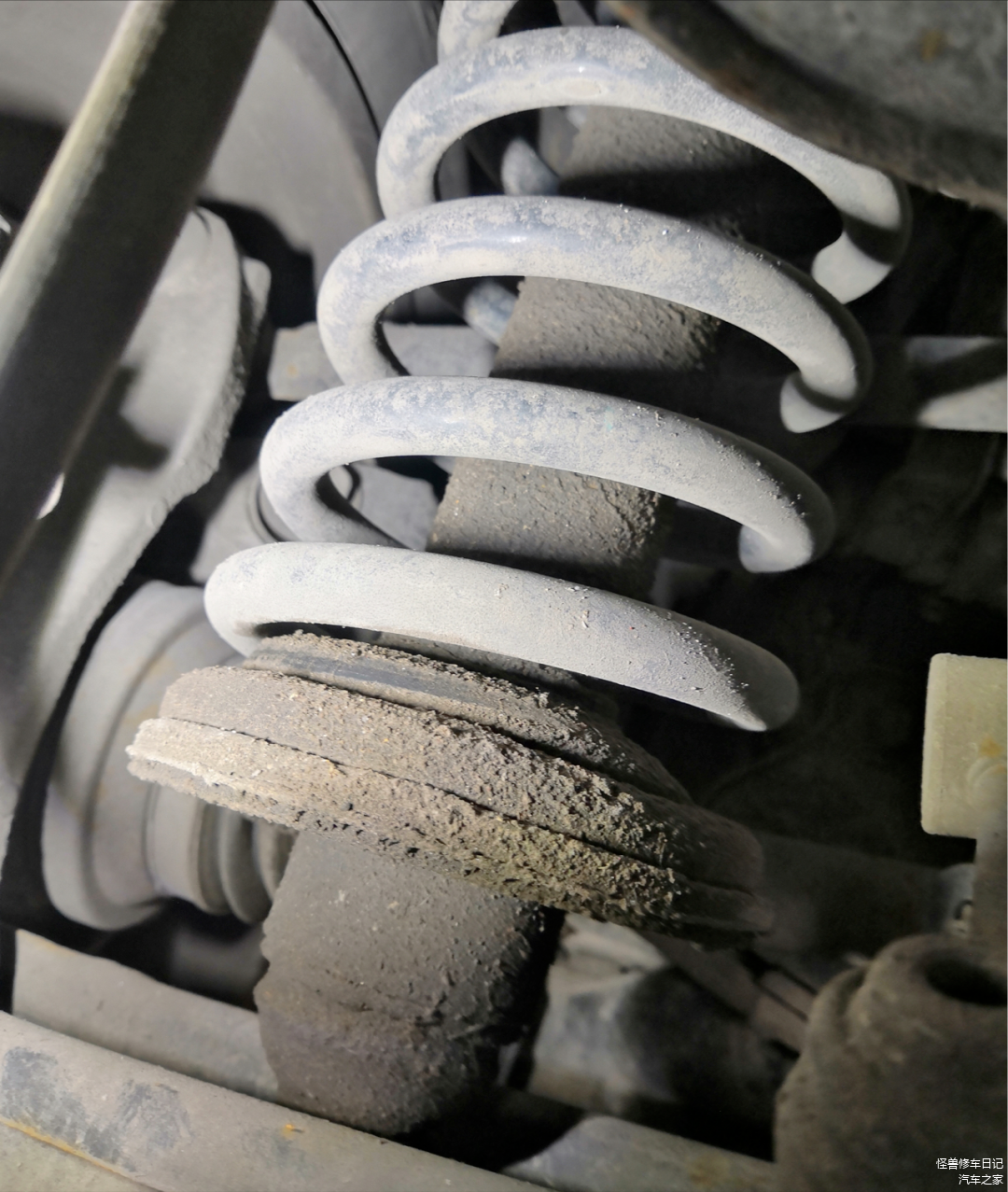 避震器漏油严重,裹了一层油泥。