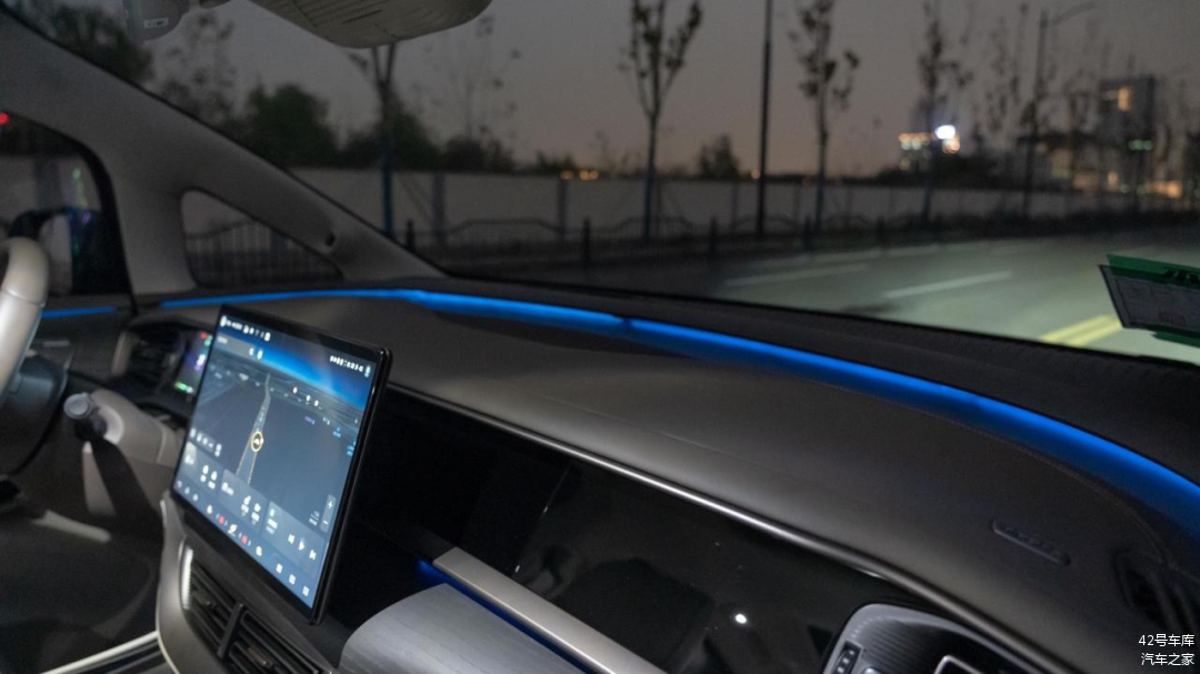 最后给大家展示一下腾势 D9 的氛围灯,前排的灯带贯穿了整个仪表台。