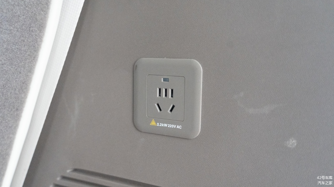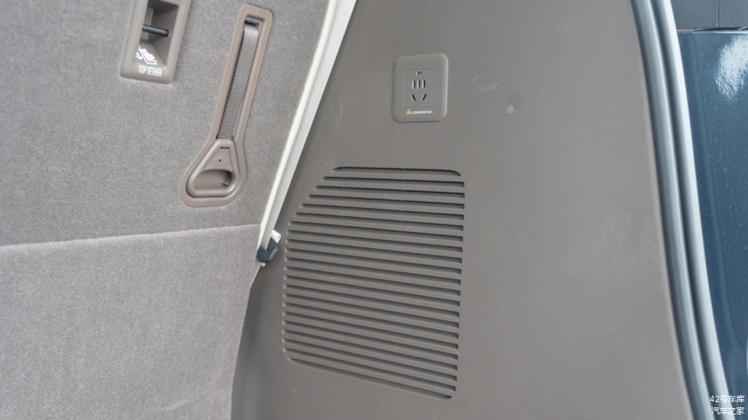 后备箱左侧是一个照明灯和一个音响扬声器,右侧有一个 220 V 电源接口,最大输出功率为 2,200 W,足够给大部分车载电器供电使用了。