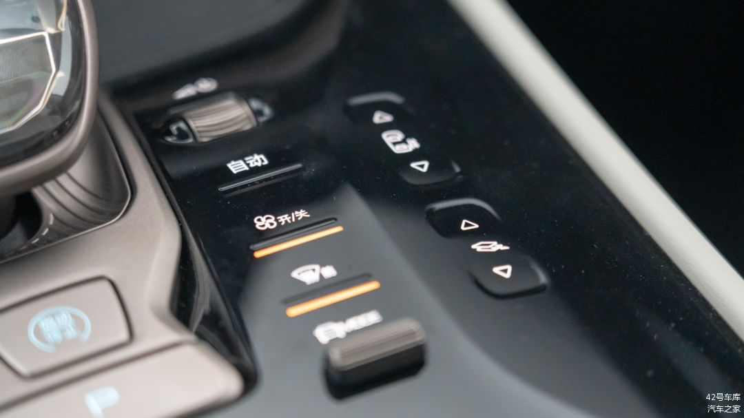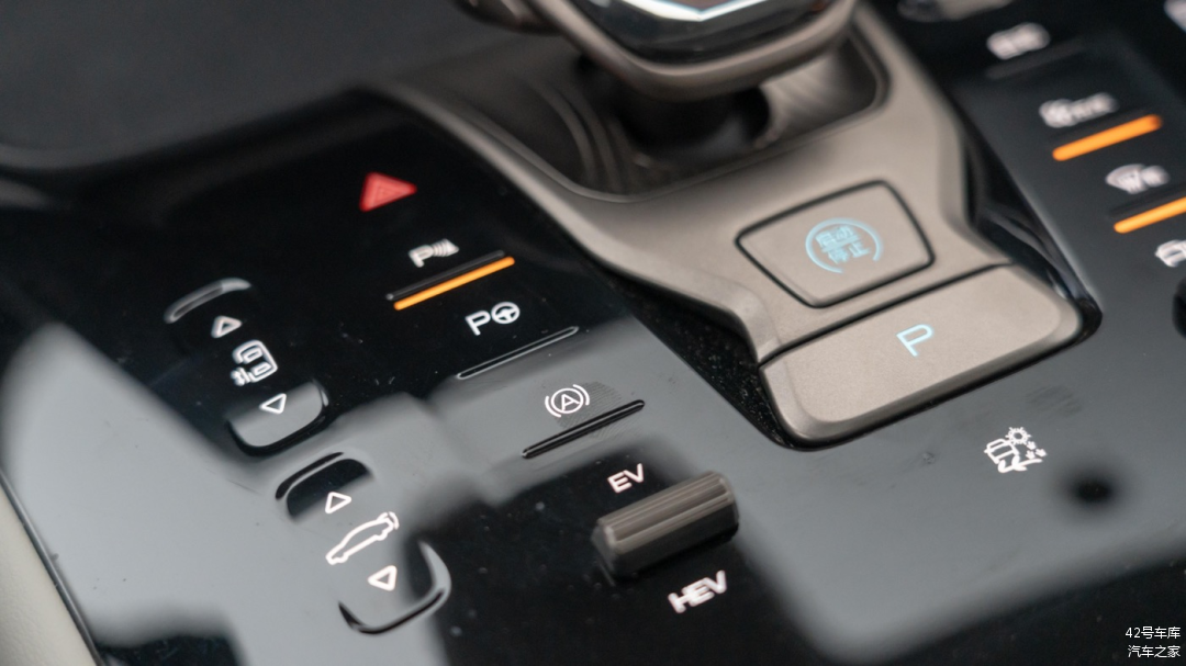 档把左侧按键分别为,第二排左侧侧滑门开关按钮、后备箱开关按钮、双闪灯按钮、电子手刹按钮、自动泊车按钮、自动驻车按钮以及纯电混动模式切换拨杆。