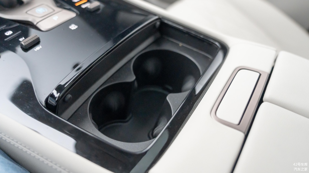 档杆后方有一块同样为黑色钢琴烤漆的保护盖板,打开后内部为两个杯架。