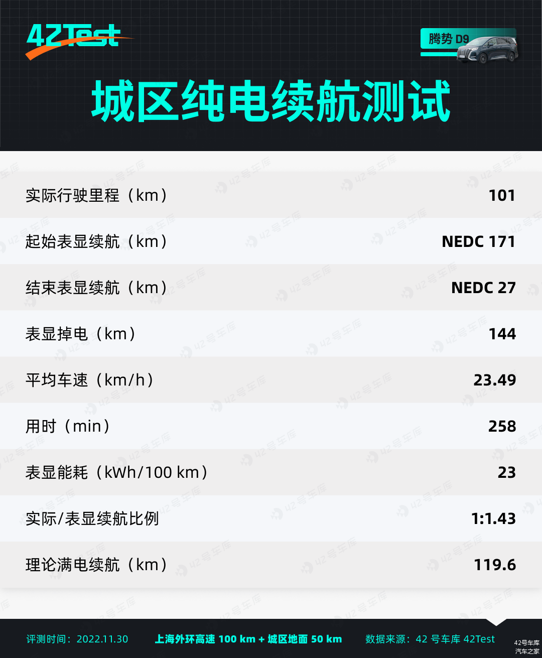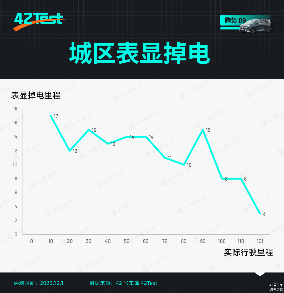 由于是混动车型,按照 42Test 的测试规则仅测试纯电城市续航,毕竟混动只用纯电跑高速也跑不了多远。