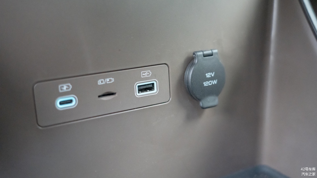掏空区域前部从左到右分别为 Type C 的快充接口、行车记录仪的存储卡卡槽、用于数据传输的 Type A 接口以及一个 12 V 最大 120 W 的车载快充接口。