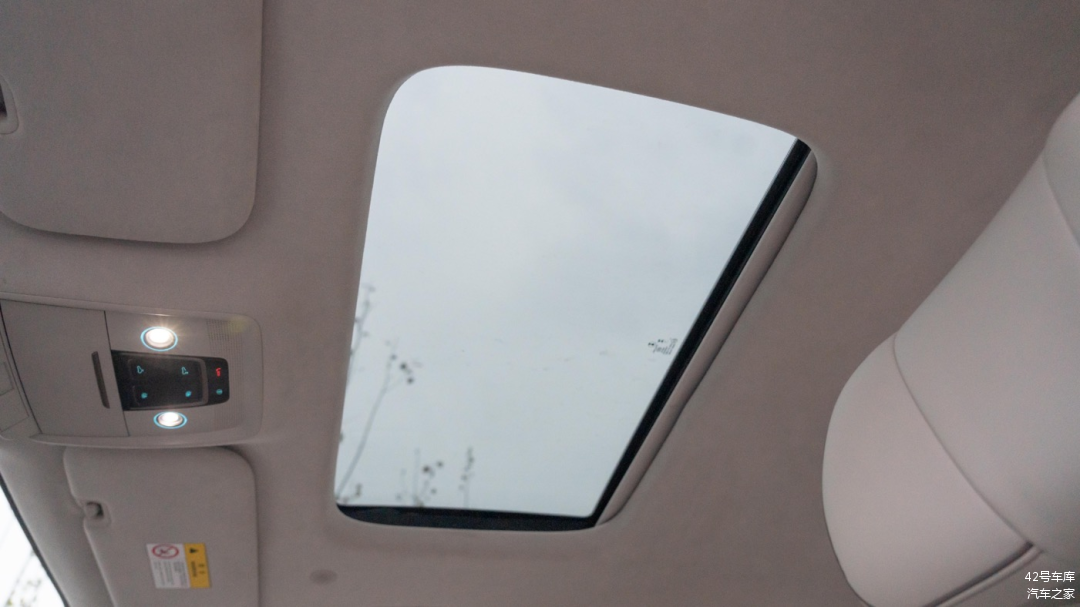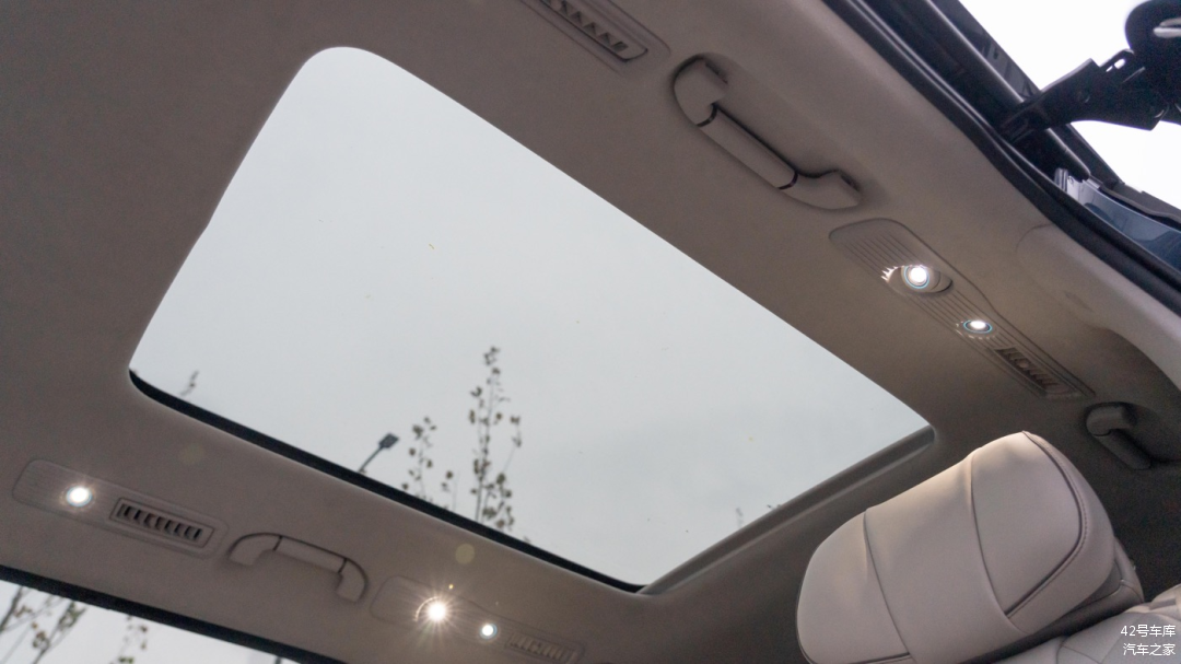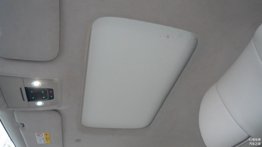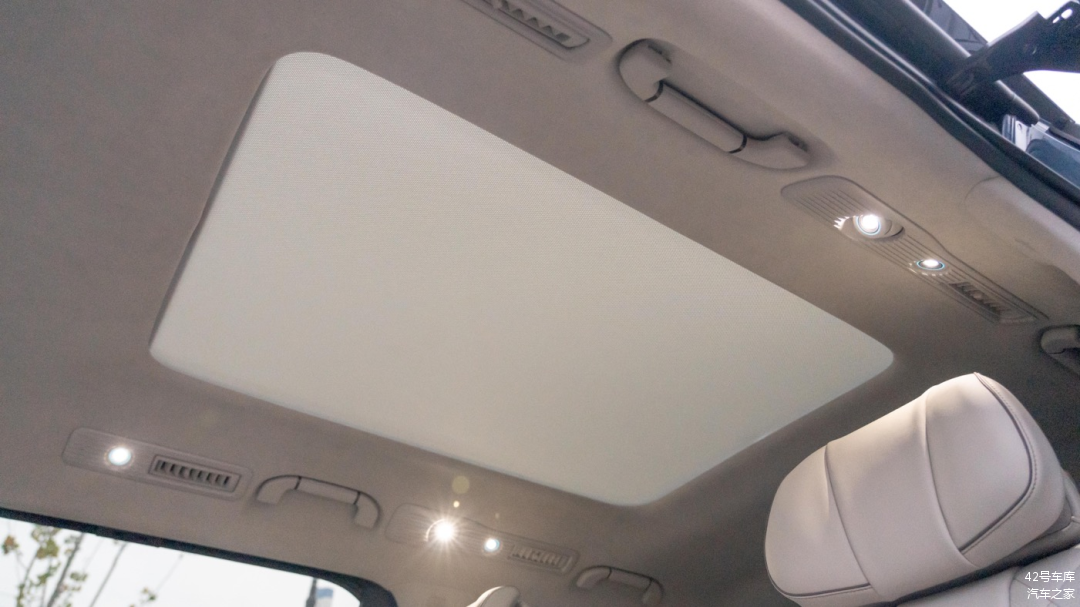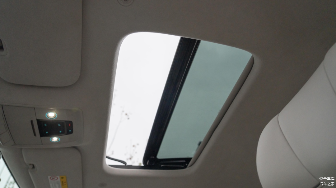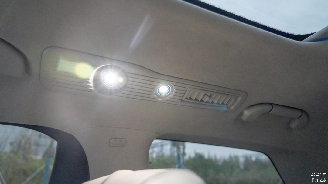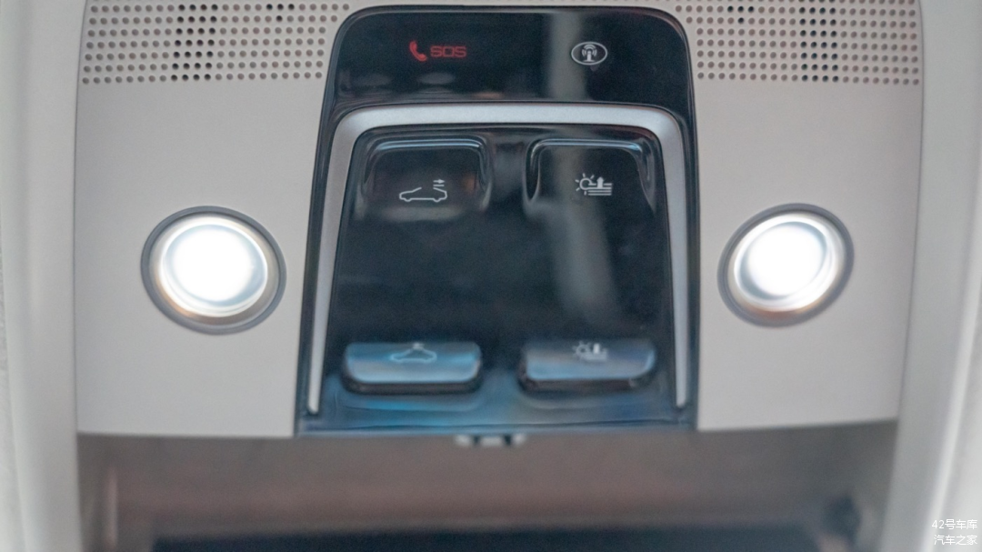 顶部中央控制区域两个阅读灯的亮度不错,按键分别为前排天窗开关按钮,以及前排遮阳帘开关按钮。