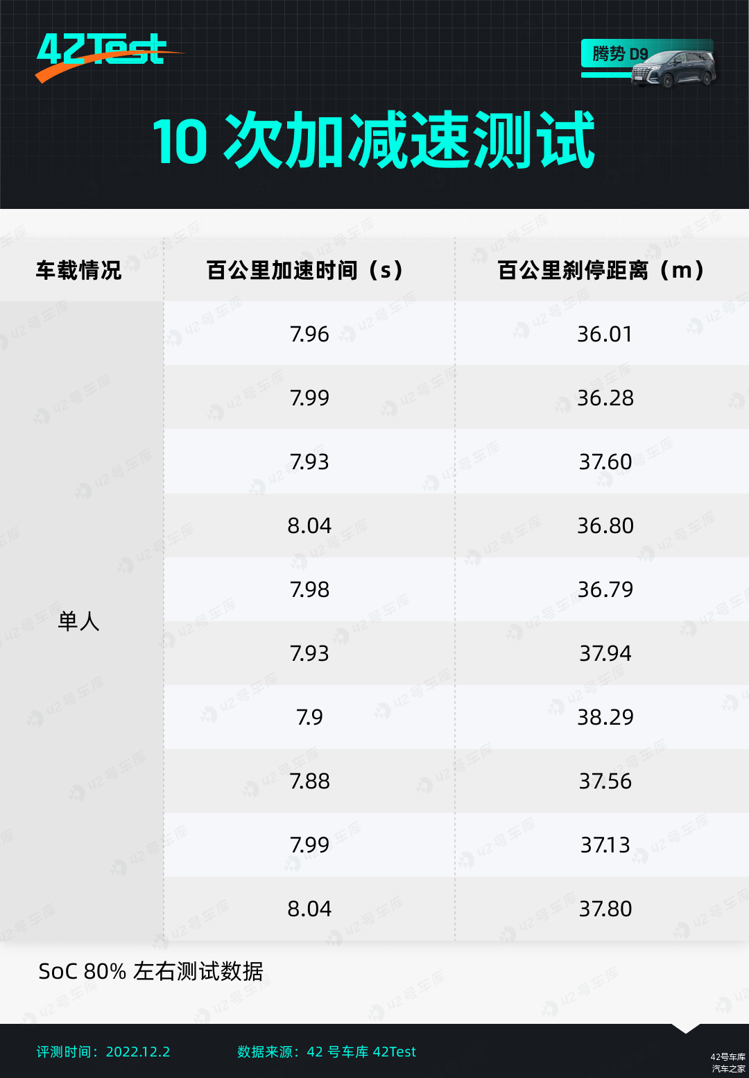 从上面的实测数据可以看到,D9 的百公里加速的平均成绩在 7.9—8 s 之间,与官方数据基本一致。