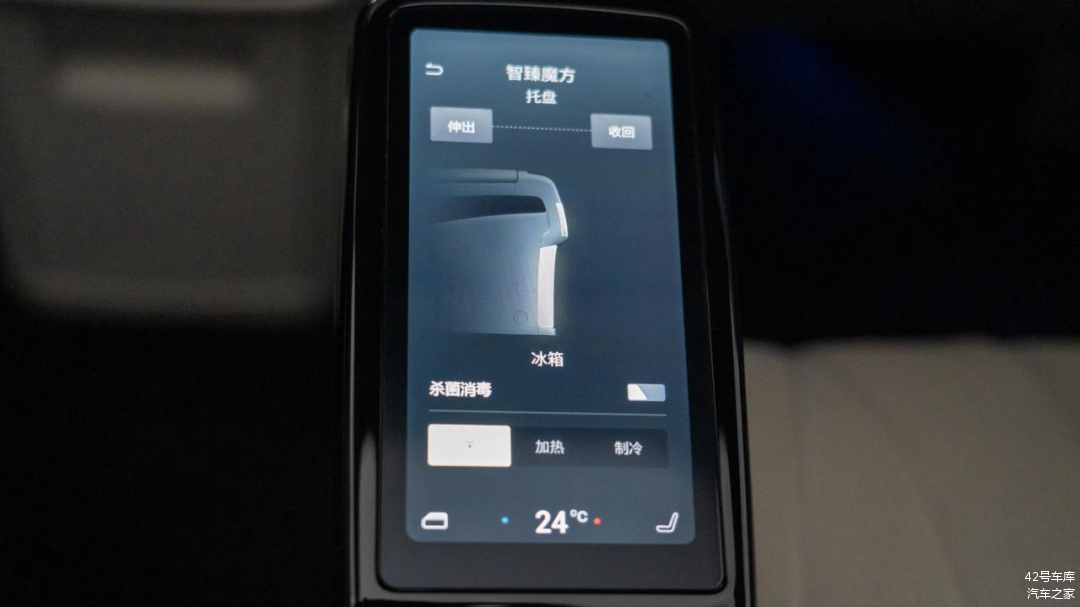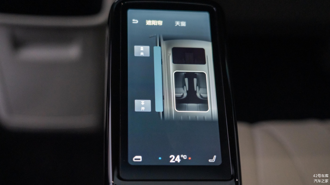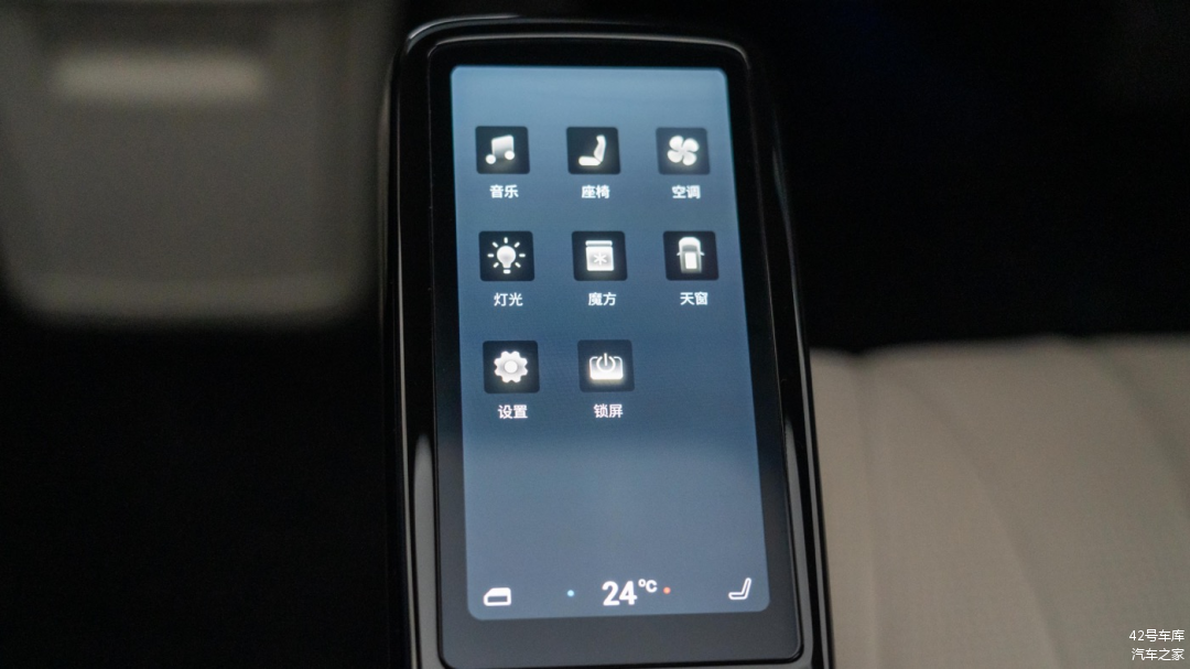 两个座椅内侧扶手上各有一块小屏幕,可以控制音乐、座椅、空调、灯光、魔方、天窗以及设置。