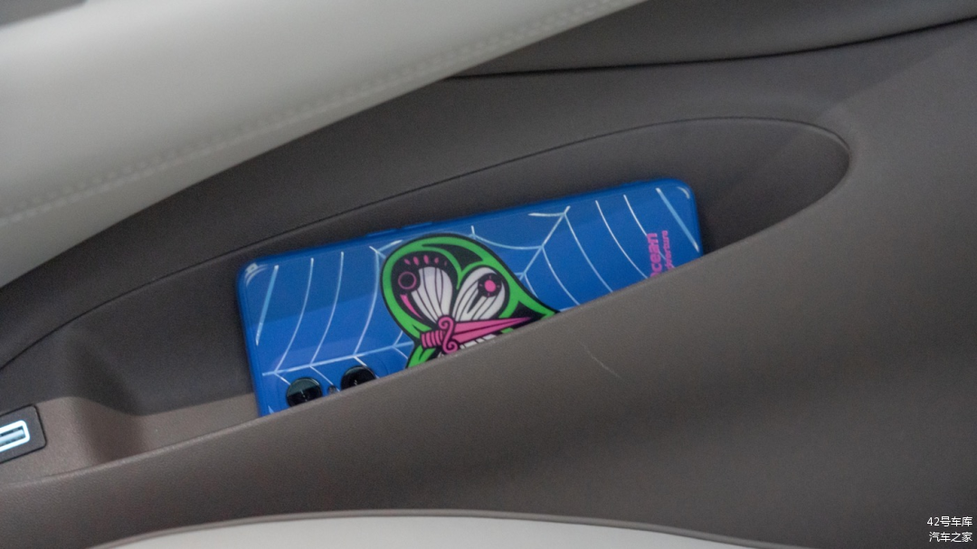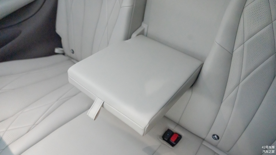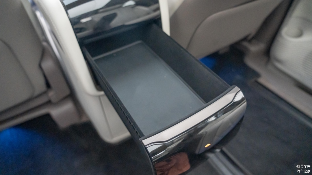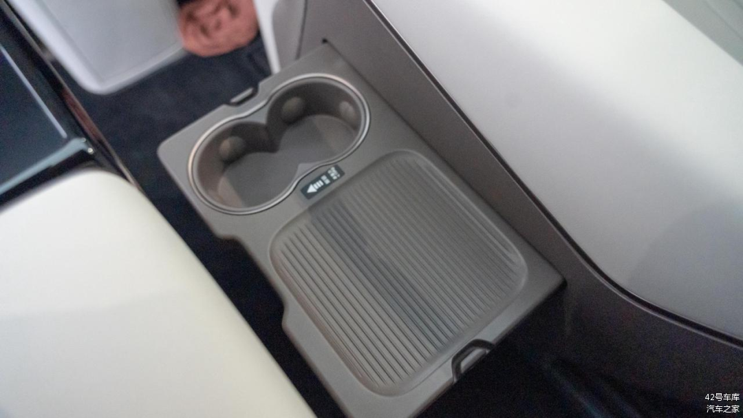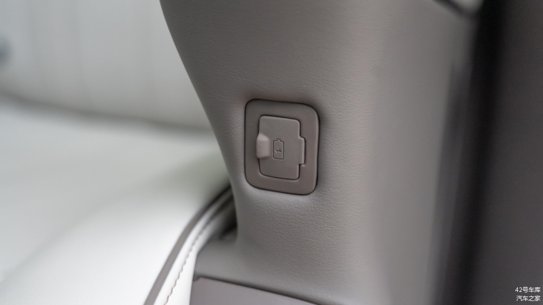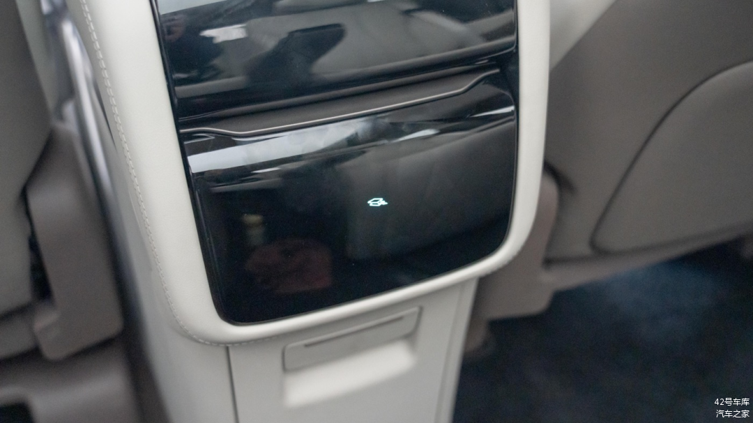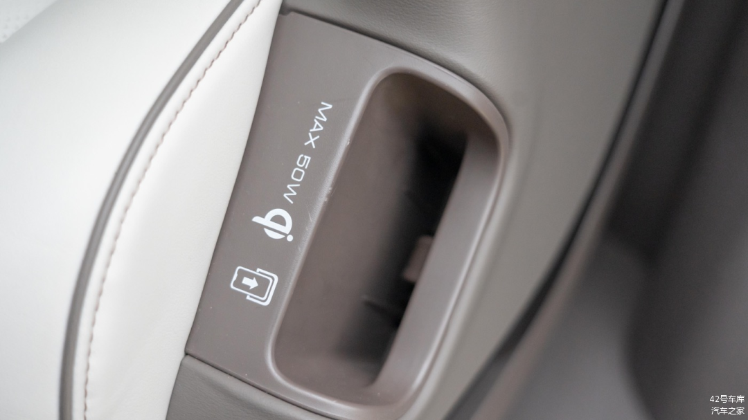 两个座椅外侧各有一个放置手机的无线充电槽,同样支持 50 W Qi 协议无线充电,和前排无线充电规格一致。需要注意的是,由于无线充电线圈位于座椅那一侧,所以充电时需要将手机屏幕朝外放置,不然无法充电。