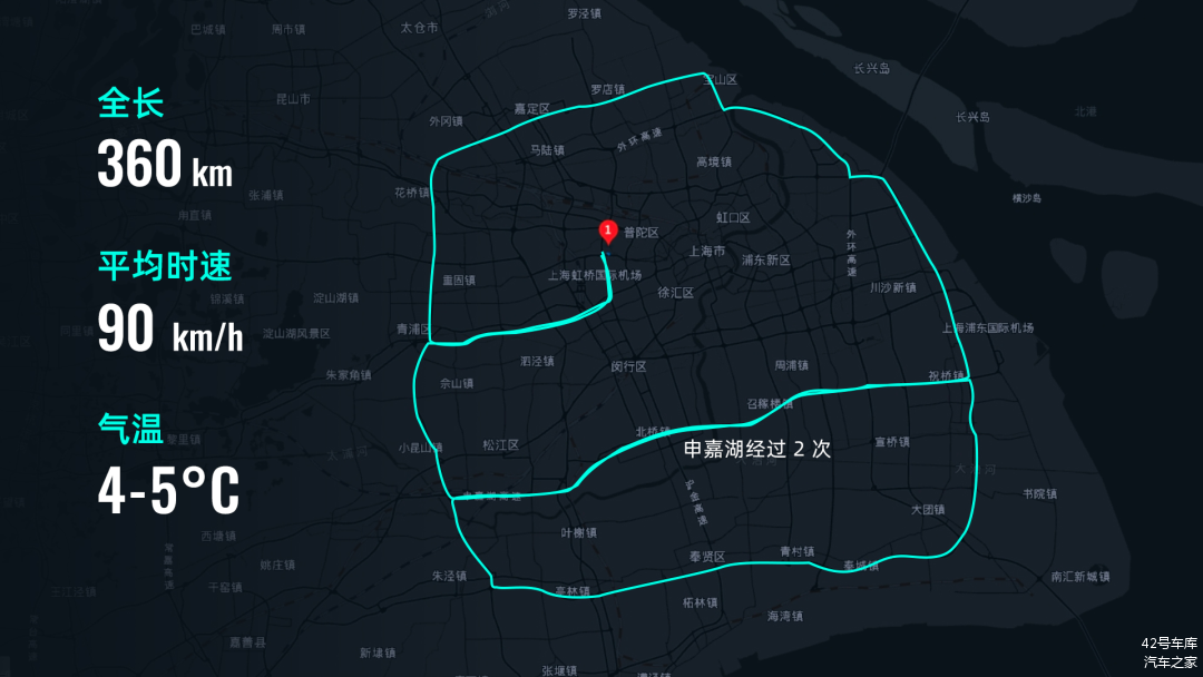 42Test 城市续航的测试路线为外环线 100 km + 城市地面道路 50 km。由于我们这辆车是外地临牌,无法进入上海外环以内,这次我们为城市地面道路测试规划了一条全新的路线。虽然拥堵程度不及上海市中心,但也覆盖了日常驾驶中的红绿灯、部分畅通以及部分拥堵的场景。