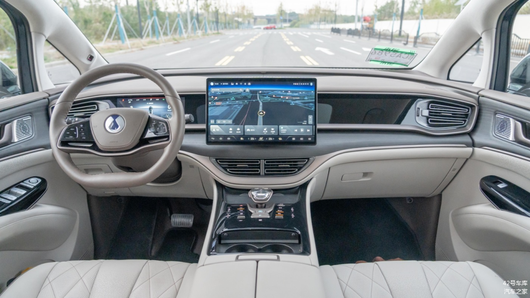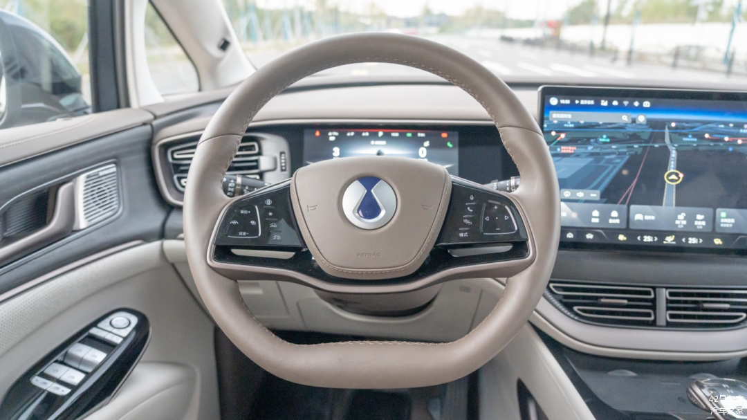 我们这辆车是一个浅色内饰的版本,整体配色以咖啡色和米白色为主。