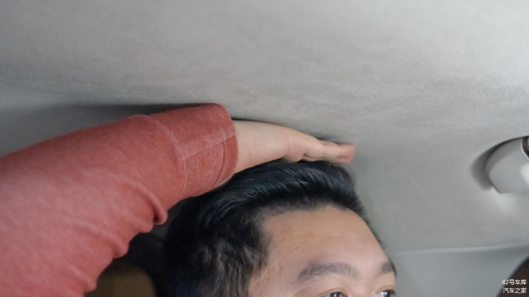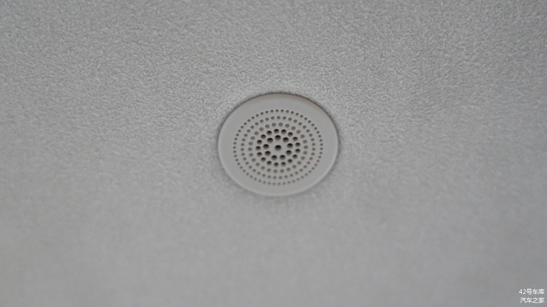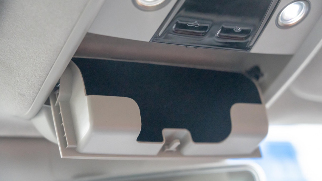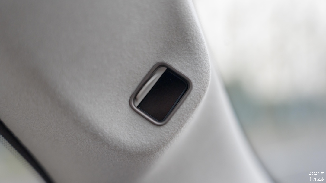 前排顶部中央有眼镜盒,另外大家应该也能看出,这辆车的顶棚采用的是翻毛皮材质。