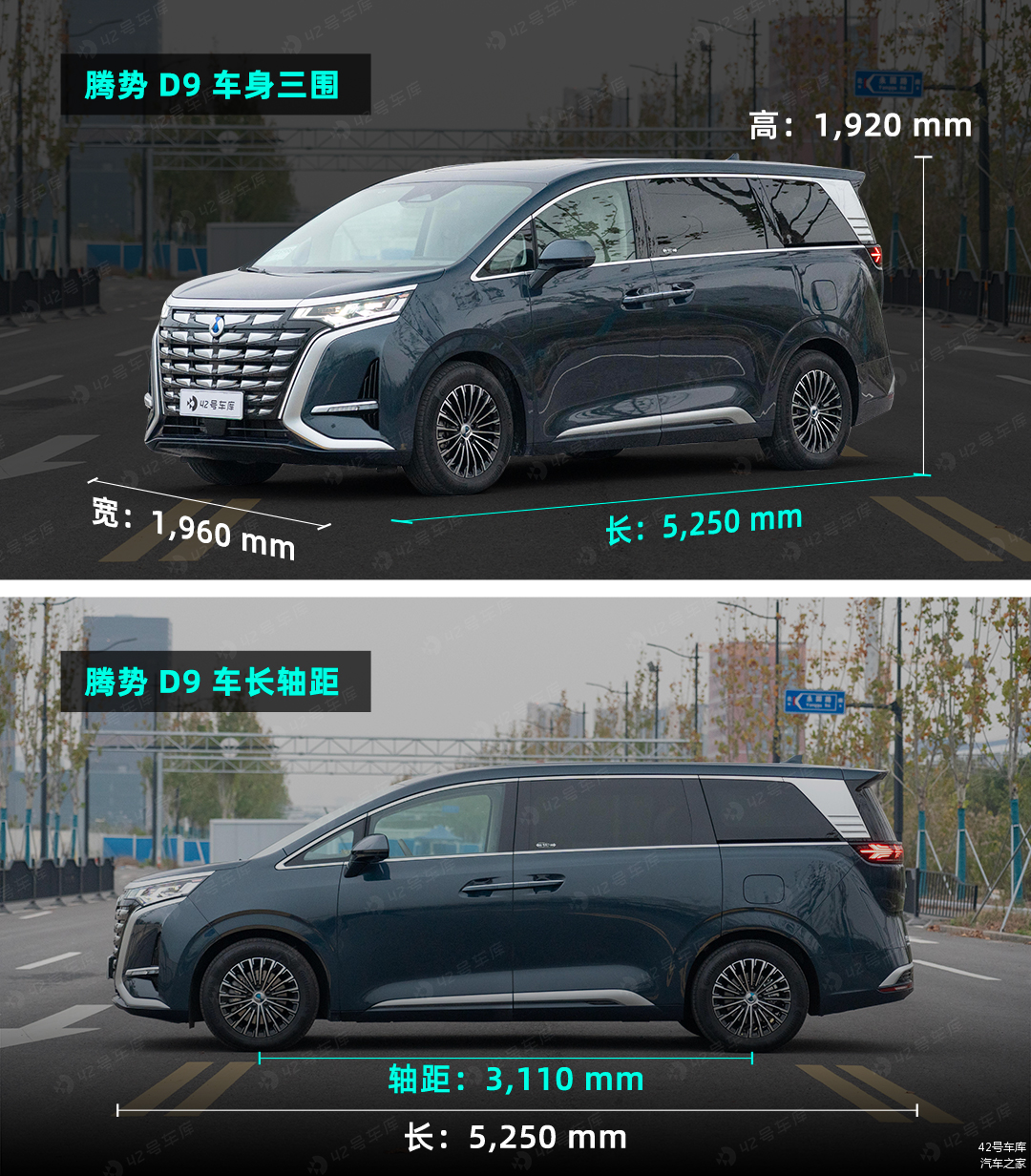 腾势 D9 的三围尺寸为 5,250 mm × 1,960 mm × 1,920 mm,轴距 3,110 mm。在 MPV 中,这个尺寸算是很大了。