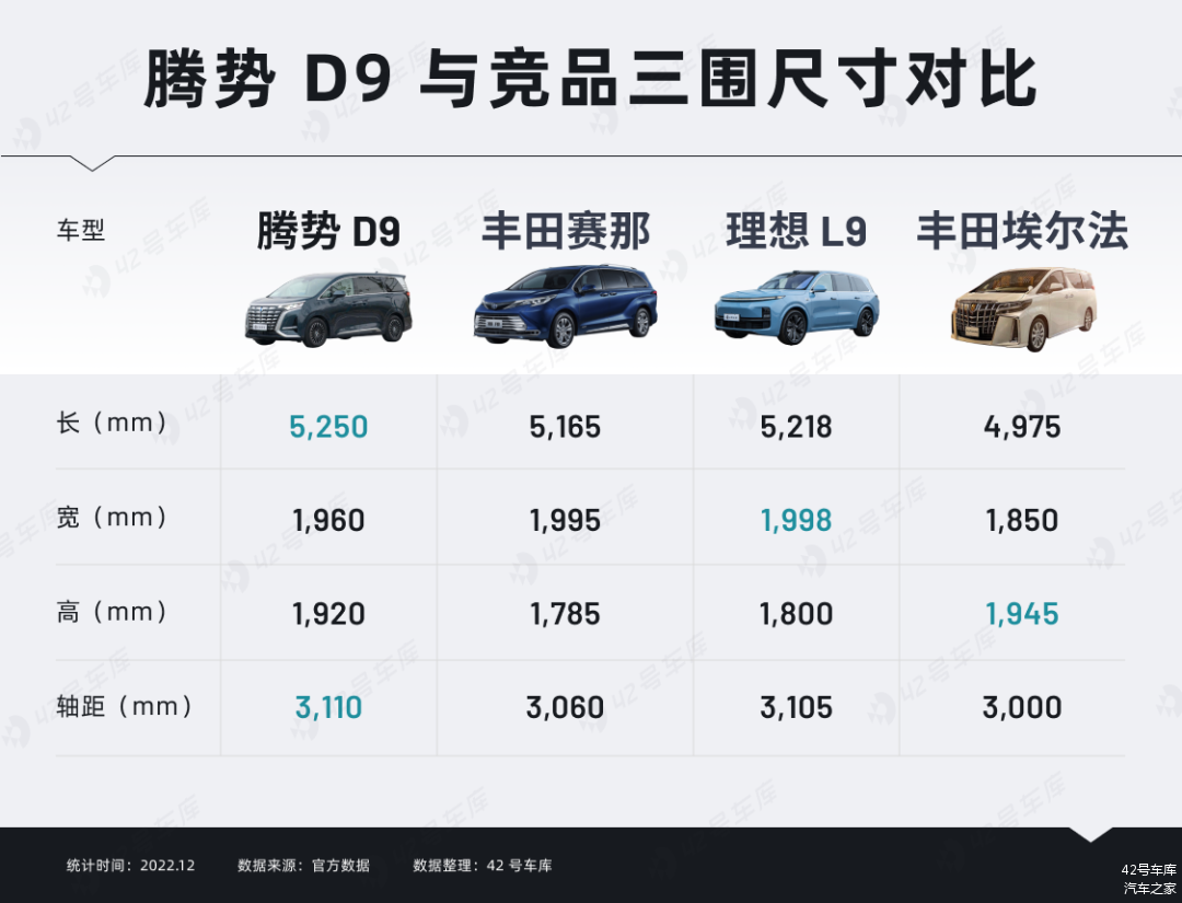 作为对比,我也列一下同价位的丰田赛那、理想 L9 以及更贵的埃尔法三围参数。可以看到,相比丰田家的两大 MPV,腾势 D9 在尺寸上均有一定优势,只有理想 L9 的尺寸基本与之相当。