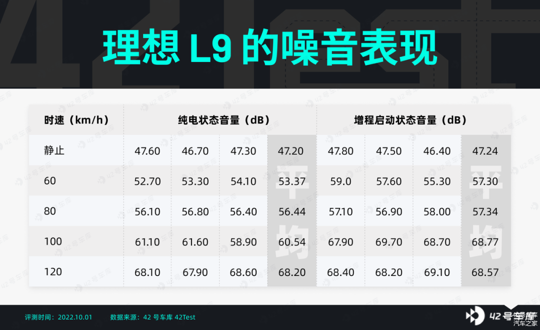 作为对比,我这里再放一张同价位的理想 L9 NVH 的实测结果。可以看到,在纯电模式下,两辆车的表现比较接近。在发动机/增程器启动的情况下,时速 120 km/h 时两辆车表现接近,静止状态和时速 80 km/h 时理想 L9 表现更好,而时速 60 km/h 和 100 km/h 时腾势 D9 的表现更好。