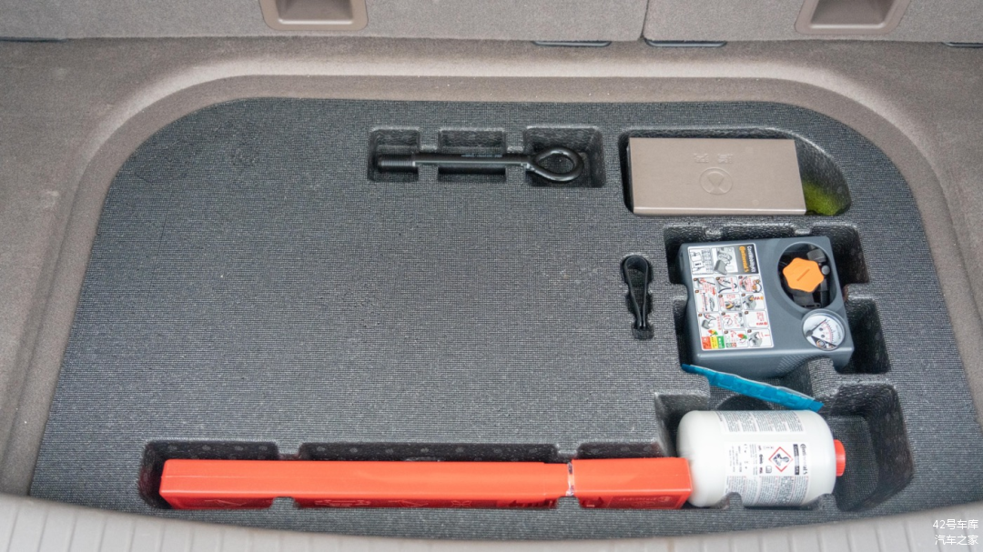 掀开后备箱下方盖板,是车辆的工具包,包含三角警示牌、拖车钩、打气筒、补胎液等应急工具。
