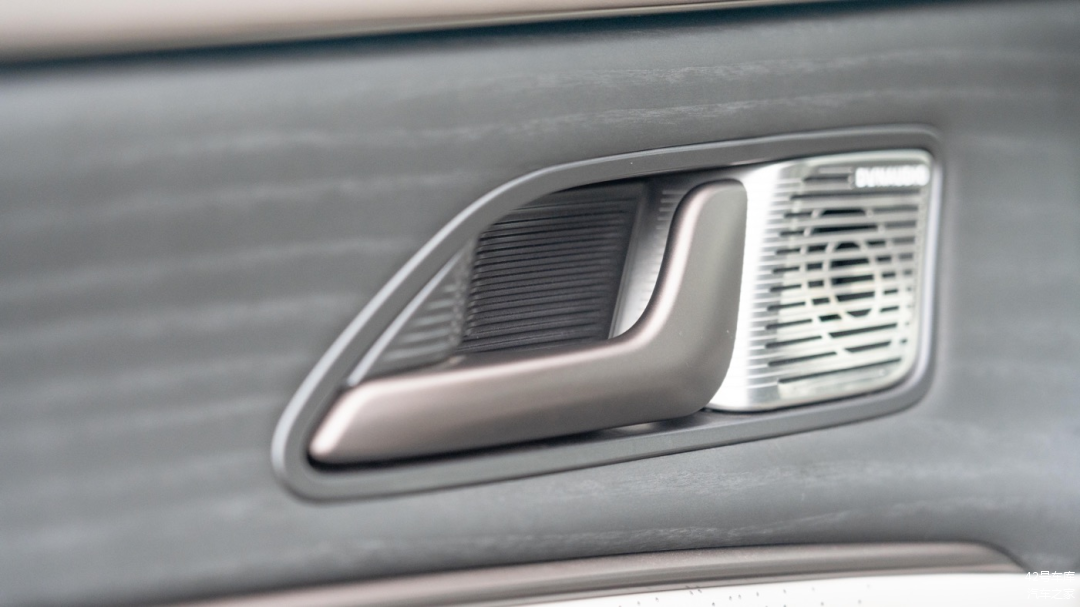 车门解锁拉手还是常规的设计,使用了棕色的金属喷砂。腾势 D9 全车采用了 14 个丹拿音响,拉手右侧就是其中一个扬声器,但金属罩摸上去会有明显的割手感,细节处理上还需努力。