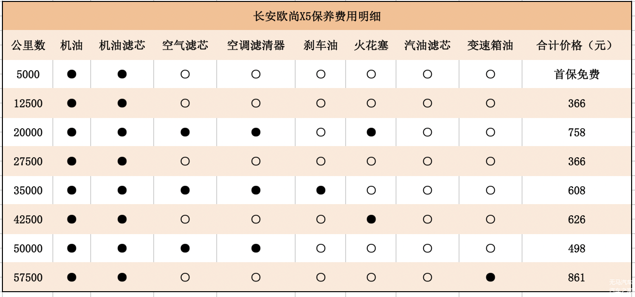 不过欧尚X5的保养频率是比较特别的,为7500公里一保,保养频率还算可以接受。可以看到,欧尚X5最便宜的一次小保养为366元,最贵的一次保养为861元。按每年行驶20000公里来算的话,三年的行驶里程就为60000公里,总费用为4083元,平均下来每年为1361元。而需要注意的是这个价格是撇除买保养套餐或代金券的结果,如果你有上述两项优惠方式的话,保养的价格应该可以再压一压。