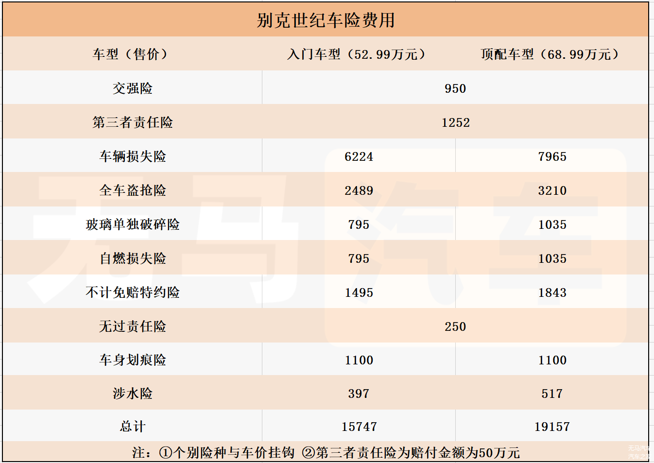 别克世纪共推出有3款配置车型,售价区间为52.99-68.99万元。需要注意的是,个别险种是与车型售价挂钩的。参考汽车之家购车工具,世纪入门车型保险费用为15747元,而顶配车型的保险费用为19157元。