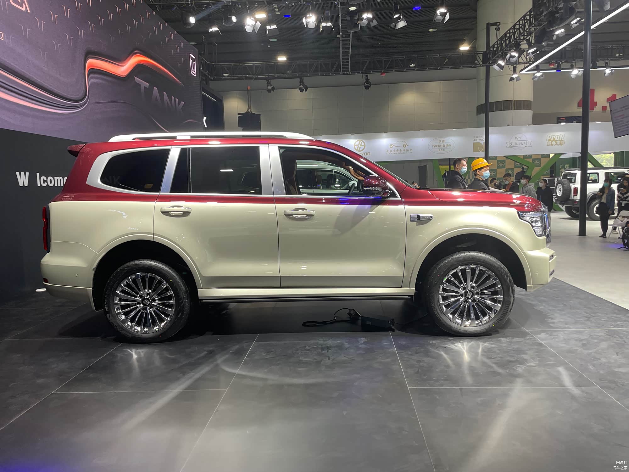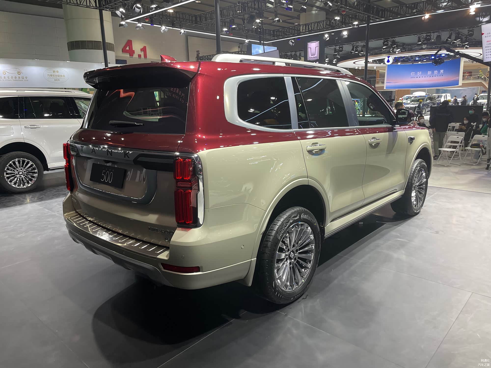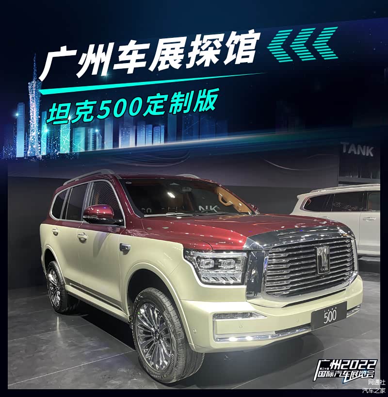 12月29日,网通社编辑在广州车展现场提前拍摄到 坦克500(图片 | 参数 | 询价)定制版实车图。 新车六边形镀铬进气格栅极具张力且内嵌坦克品牌车标,引擎盖隆起的肌力线条具有视觉冲击力。作为定制版车型,该车采用双拼色设计,侧面凹凸有致层次丰富的车身线条让整车更具有一份“野性”。