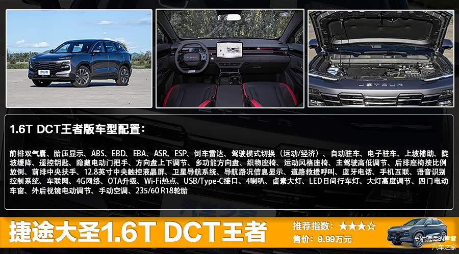 作为目前入门级车型的1.6T DCT王者版,其售价为9.99万元,在配置方面它配备了前排双气囊、胎压显示、ABS、EBD、EBA、ASR、ESP、倒车雷达、驾驶模式切换(运动/经济)、自动驻车、电子驻车、上坡辅助、陡坡缓降、遥控钥匙、隐藏电动门把手、方向盘上下调节、多功能方向盘、织物座椅、运动风格座椅、主驾驶高低调节、后排座椅按比例放倒、前排中央扶手、12.8英寸中央触控液晶屏、卫星导航系统、导航路况信息显示、道路救援呼叫、蓝牙电话、手机互联、语音识别控制系统、车联网、4G网络、OTA升级、Wi-Fi热点、USB/Type-C接口、4喇叭、卤素大灯、LED日间行车灯、大灯高度调节、四门电动车窗、外后视镜电动调节、手动空调、235/60 R18轮胎。从配置和价格来看,虽然说1.6T DCT王者版的配置表现一般,但是对于这个价位的车型来说还是基本够用的。