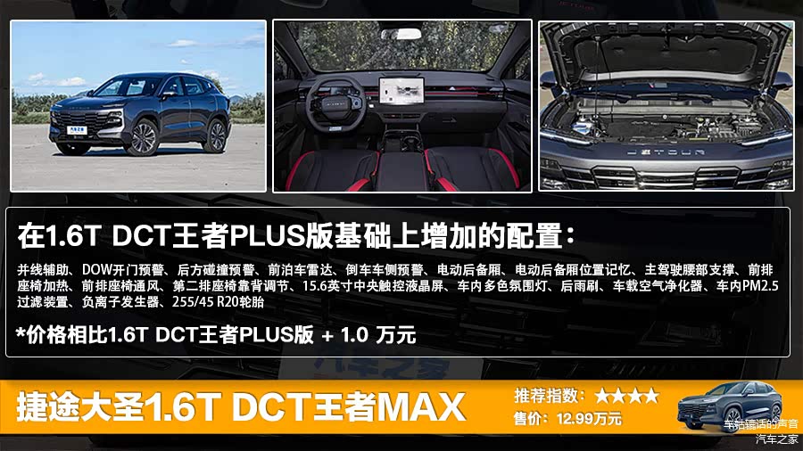 与1.6T DCT王者PLUS相比,1.6T DCT王者MAX版在价格方面对了1万元,配置方面则增加了并线辅助、DOW开门预警、后方碰撞预警、前泊车雷达、倒车车侧预警、电动后备厢、电动后备厢位置记忆、主驾驶腰部支撑、前排座椅加热、前排座椅通风、第二排座椅靠背调节、15.6英寸中央触控液晶屏、车内多色氛围灯、后雨刷、车载空气净化器、车内PM2.5过滤装置、负离子发生器、255/45 R20轮胎。从增加的配置来看,这1万元多花的也比较值,只是其接近13万元的售价需要考量一下购买者的购车预算。