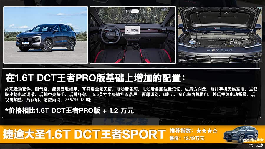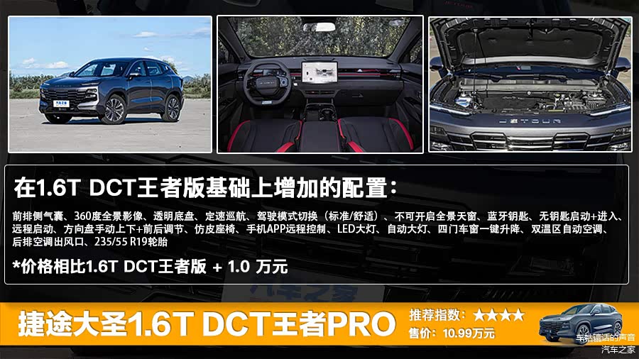 与1.6T DCT王者版相比,价格贵了1万元的1.6T DCT王者PRO版在配置方面增加了前排侧气囊、360度全景影像、透明底盘、定速巡航、驾驶模式切换(标准/舒适)、不可开启全景天窗、蓝牙钥匙、无钥匙启动+进入、远程启动、方向盘手动上下+前后调节、仿皮座椅、手机APP远程控制、LED大灯、自动大灯、四门车窗一键升降、双温区自动空调、后排空调出风口、235/55 R19轮胎。用1万元可以换来这么多的配置,并且还有很多实用性配置,价格还是比较划算的。