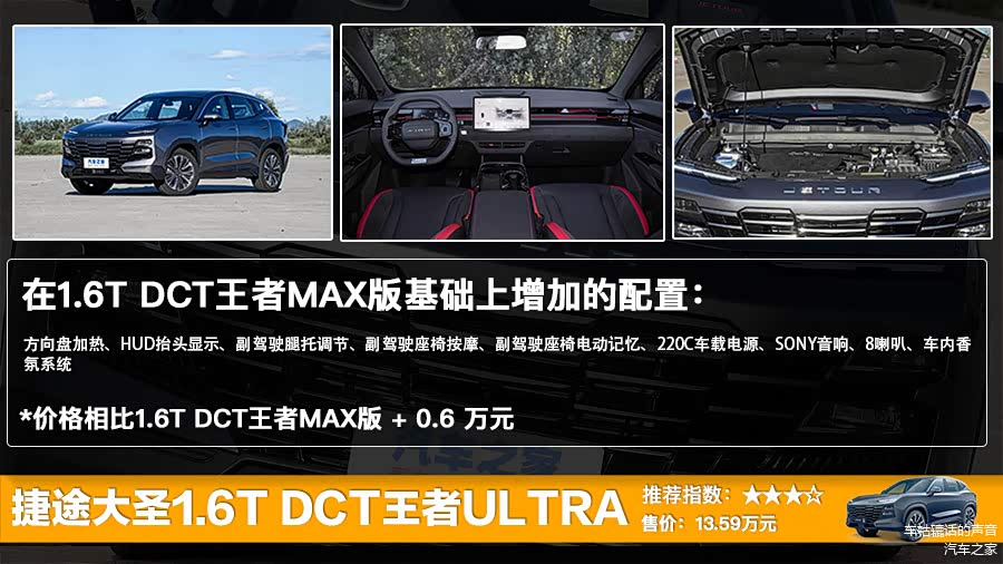 作为目前全系最顶配的1.6T DCT王者ULTRA版车型来说,它的配置比1.6T DCT王者MAX版多了方向盘加热、HUD抬头显示、副驾驶腿托调节、副驾驶座椅按摩、副驾驶座椅电动记忆、220V车载电源、SONY音响、8喇叭、车内香氛系统,两款车的价格相差了0.6万元,虽然说差价不大,但是顶配车型13.59万元的售价确实会让一部分消费者考虑一下。