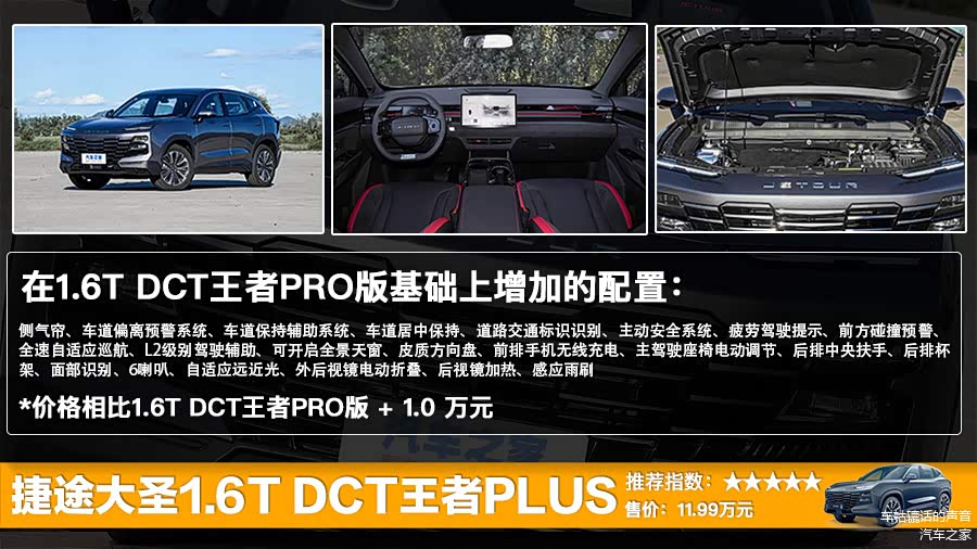 与1.6T DCT王者PRO版相比,1.6T DCT王者PLUS版在配置方面增加了侧气帘、车道偏离预警系统、车道保持辅助系统、车道居中保持、道路交通标识识别、主动安全系统、疲劳驾驶提示、前方碰撞预警、全速自适应巡航、L2级别驾驶辅助、可开启全景天窗、皮质方向盘、前排手机无线充电、主驾驶座椅电动调节、后排中央扶手、后排杯架、面部识别、6喇叭、自适应远近光、外后视镜电动折叠、后视镜加热、感应雨刷,价格方面则贵了1万元。可以说,这1万元更多换来的是驾驶辅助配置,整体看来还是很值得的。