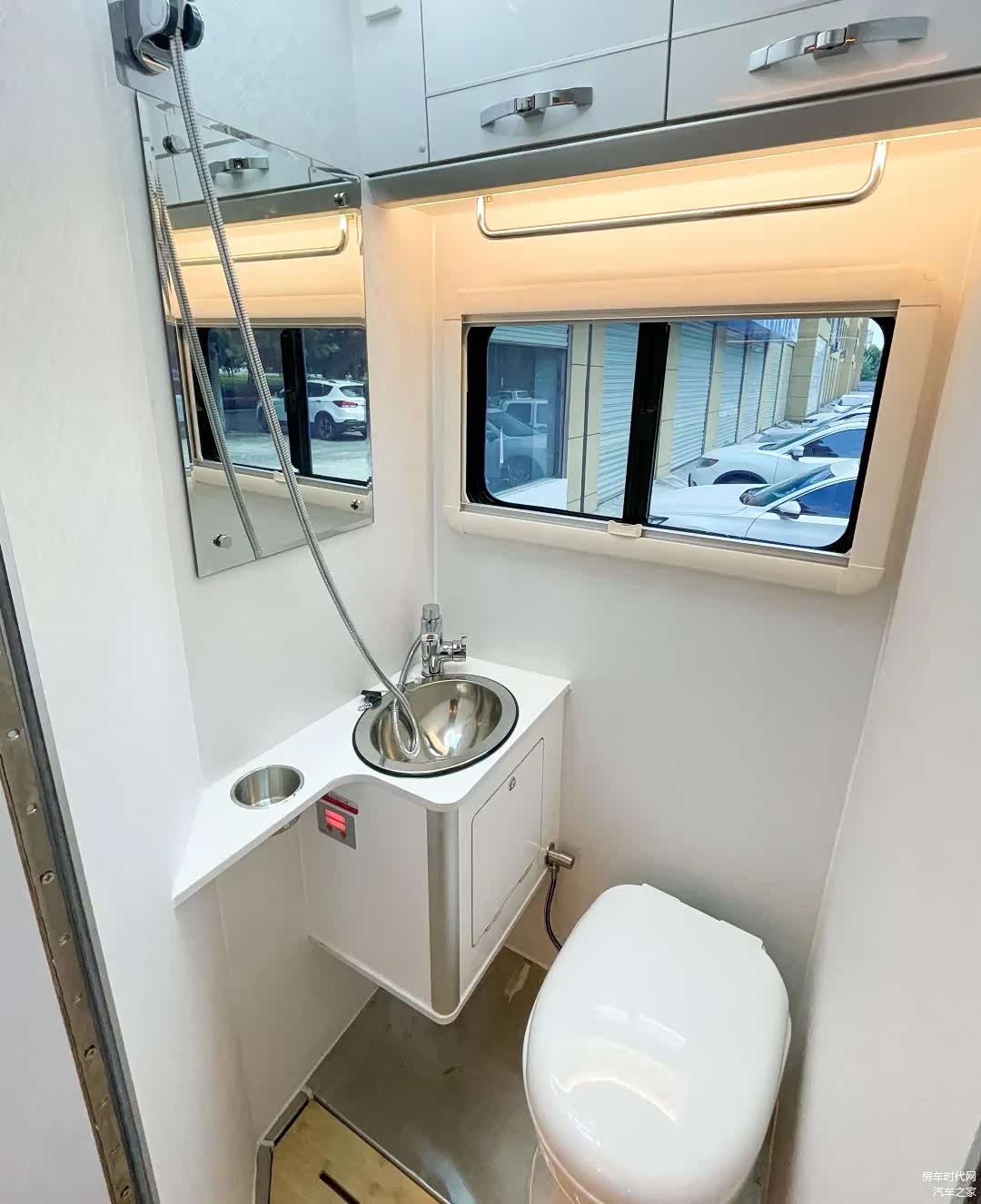 卫生间采用独立式设计,内部配备有房车专用抽拉马桶、化妆镜、毛巾架、升降式淋浴花洒、卫浴洗手盆等,水路系统方面,配备有280L净水箱、100L污水箱。电路系统方面,配备有400Ah锂电池、3000W充电逆变一体机等。