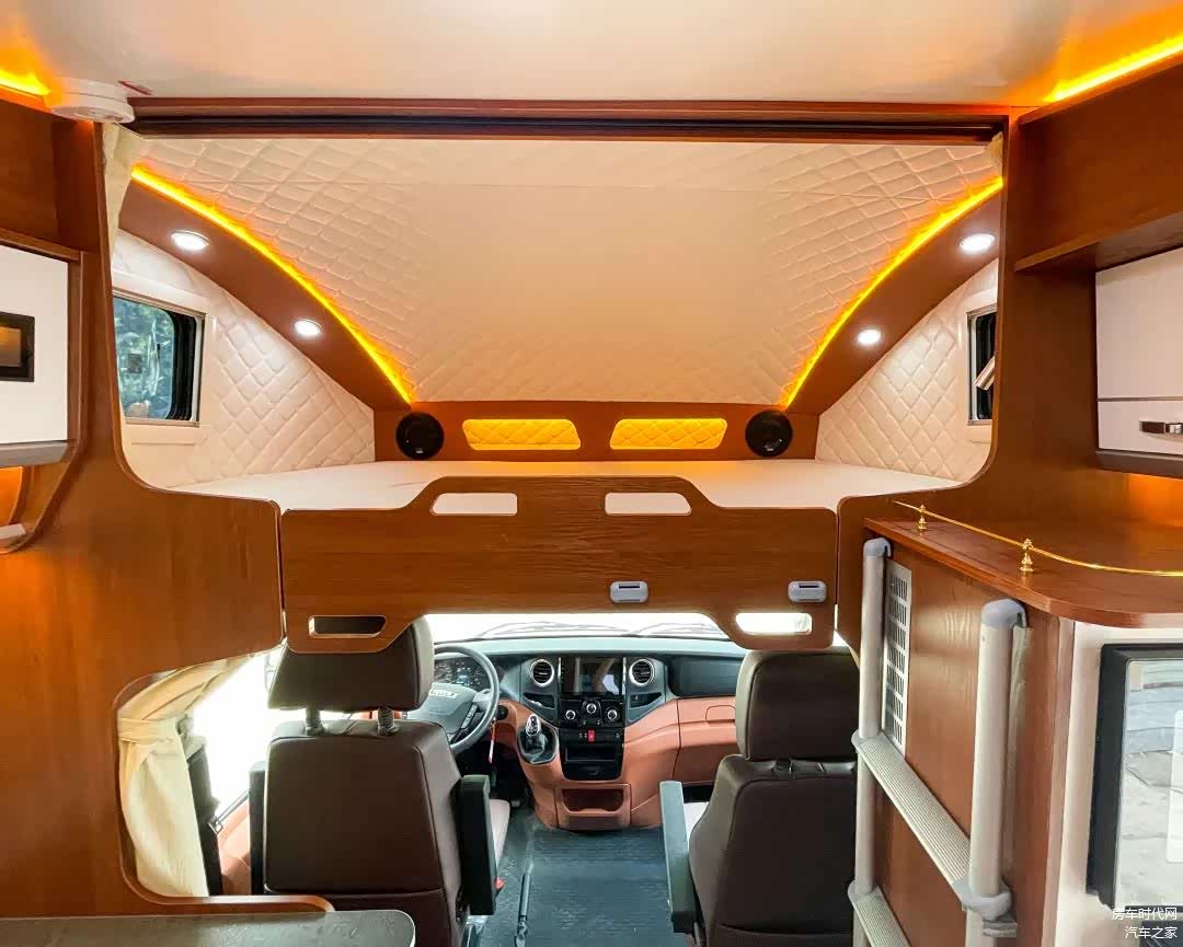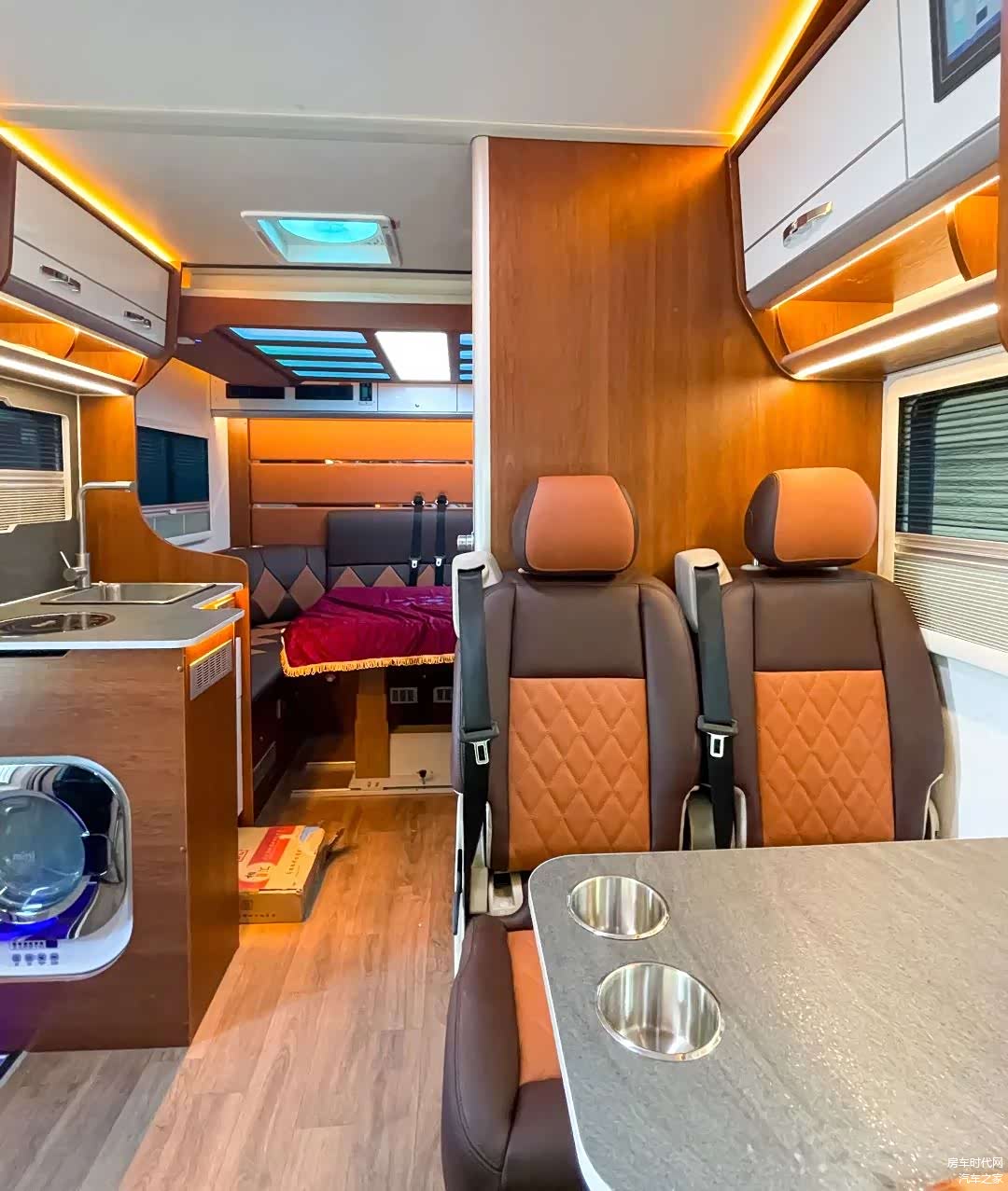 内部设计以深木色为主,增加奢华氛围。车内布局清晰,从前到后分别为驾驶室、会客区、厨房区,休息区,休息区上方还巧妙安装有电动吊床作为休息区域。
