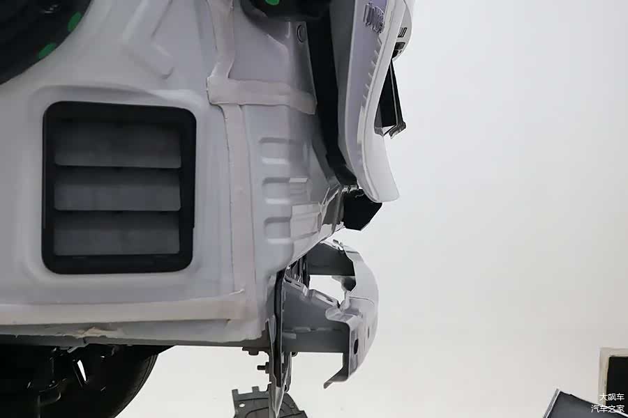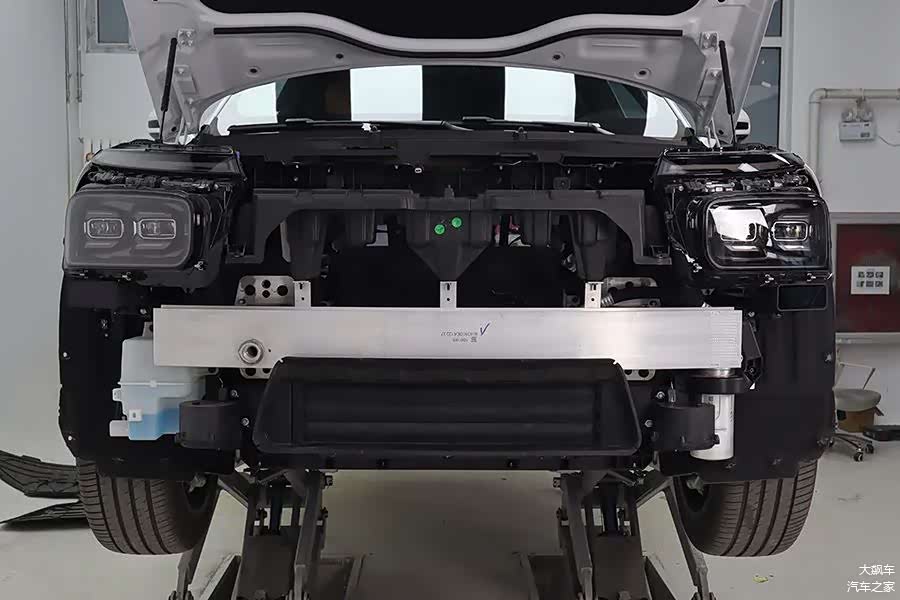 拆掉前保险杠,内部有一根铝合金防撞梁,厚度为3.27毫米,截面呈“日”字形,能覆盖车头的69.35%。