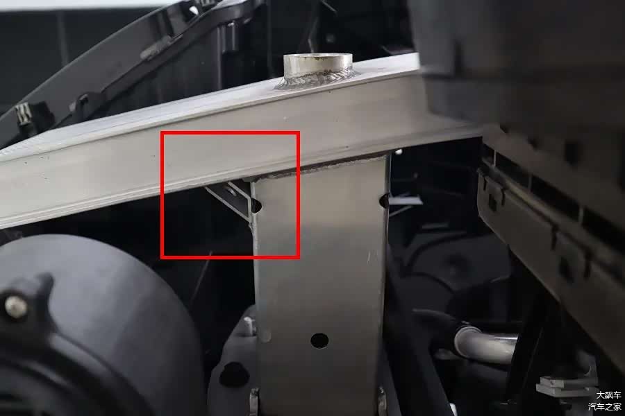 防撞梁下方有主动式进气格栅,后方是斜置的散热器,和特斯拉的布局有些相似。