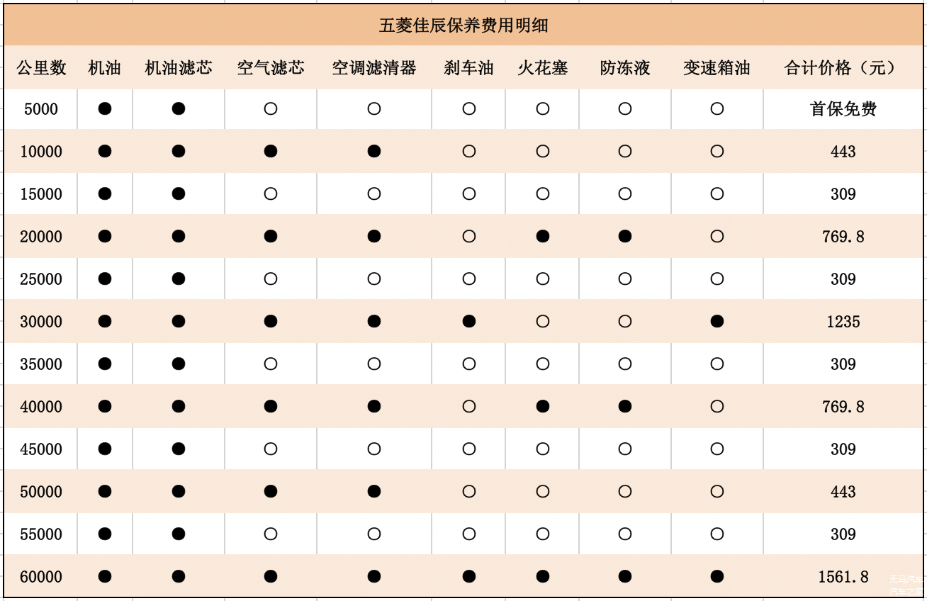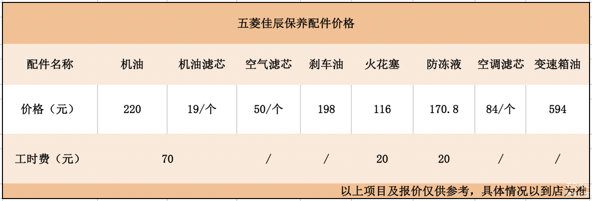 由上面的配件价目表可以看到,作为一台五菱,佳辰整体的配件价格还是比较便宜的,因此它每一次保养的价格都能得到控制。