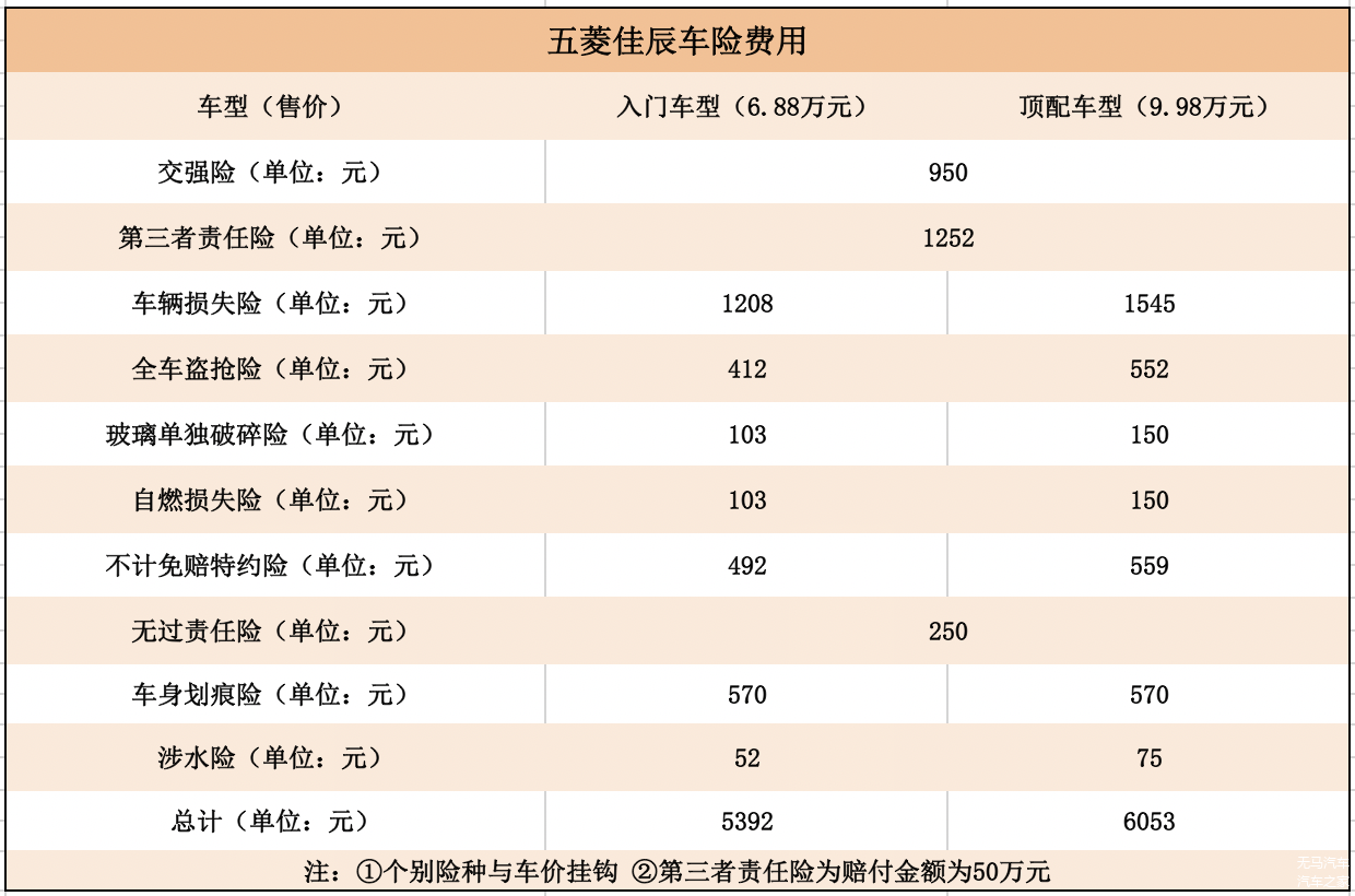 目前五菱佳辰共计推出7款车型,售价区间为6.88—9.98万元,而个别险种又是和车价挂钩的,所以经过计算,五菱佳辰入门车型的保险费用为5392元,顶配车型的保险费用为6053元。当然,如果没有出险的话,后续的保险是会逐年下降的,因为这里计算的是全险,所以会比较贵一些,我们就姑且先算五菱佳辰每年的保险费用为5392元。