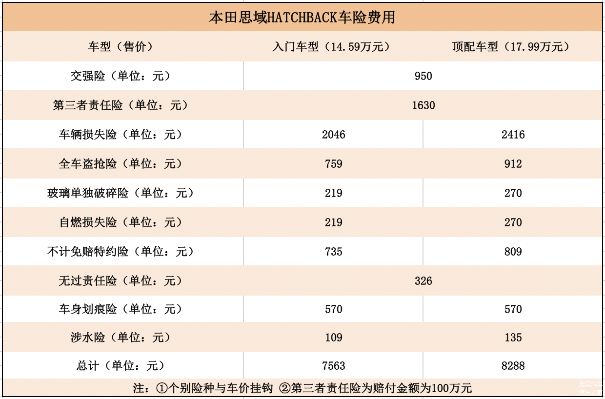 目前思域HATCHBACK共计推出6款车型,售价区间为14.59—17.99万元,而个别险种又是和车价挂钩的,所以经过计算,思域HATCHBACK入门车型的保险费用为7563元,顶配车型的保险费用为8288元。当然,如果没有出险的话,后续的保险是会逐年下降的,因为这里计算的是全险,所以会比较贵一些,我们就姑且先算思域HATCHBACK每年的保险费用为7563元。
