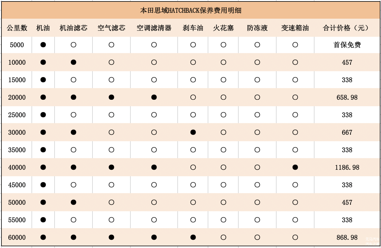 但相对来说,因为思域HATCHBACK官方用的矿物机油,保养频率还是比较高的,为5000公里一保,比起很多品牌都要高,因此最终其养车费用会不少,当然大家也可以使用全合成机油,把保养频率缩至10000公里一保。可以看到,思域HATCHBACK最便宜的一次小保养为338元,最贵的一次保养为1186.98元。按每年行驶20000公里来算的话,三年的行驶里程就为60000公里,总费用为5985.94元,平均下来每年为1995.3元。而需要注意的是这个价格是撇除买保养套餐或代金券的结果,如果你有上述两项优惠方式的话,保养的价格应该可以再压一压。