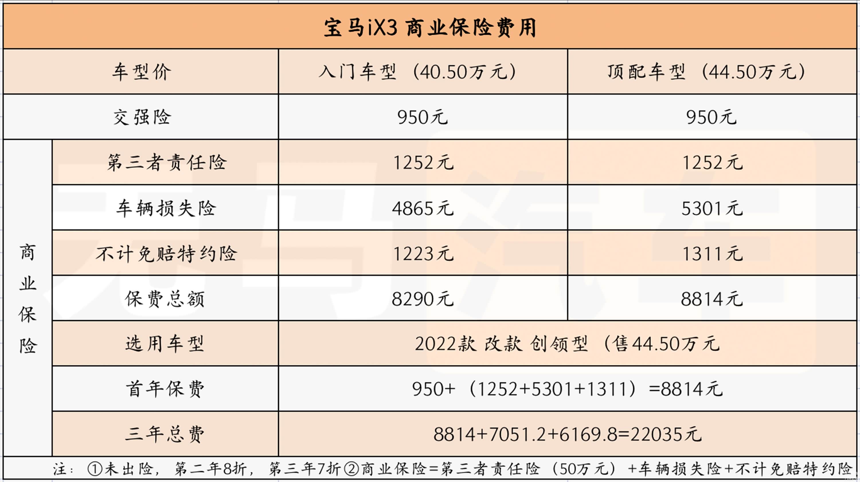 在售车型版本有限,我们就以顶配的创领型为参考车型,计算宝马iX3在保险方面需要产生的总费用,得出的结果为22035元,平均一年分摊7345元。