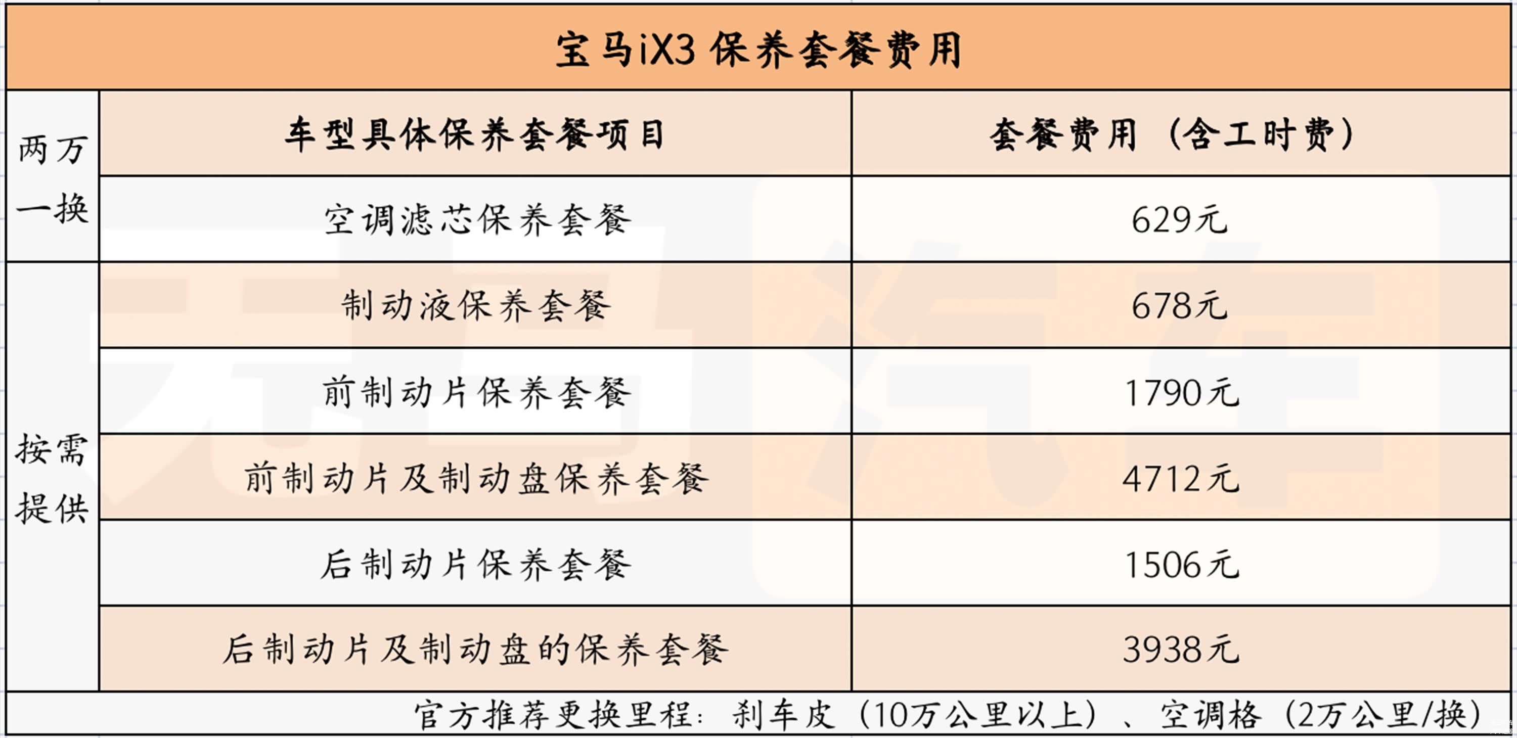 过往有阅读我们《养车成本分析》栏目的朋友应该都清楚,过去我们聚焦的车型主体多为燃油车,所以会为大家列出具体配件的配件价和工时费,但宝马iX3作为一款纯电车就不必这么麻烦了,得益于采用电驱系统,它基本不用进行燃油车常有的车辆保养,只需定期(2万公里/换)更换空调格,并按需保养制动系统即可,详细的保养套餐(含工时费)如下。