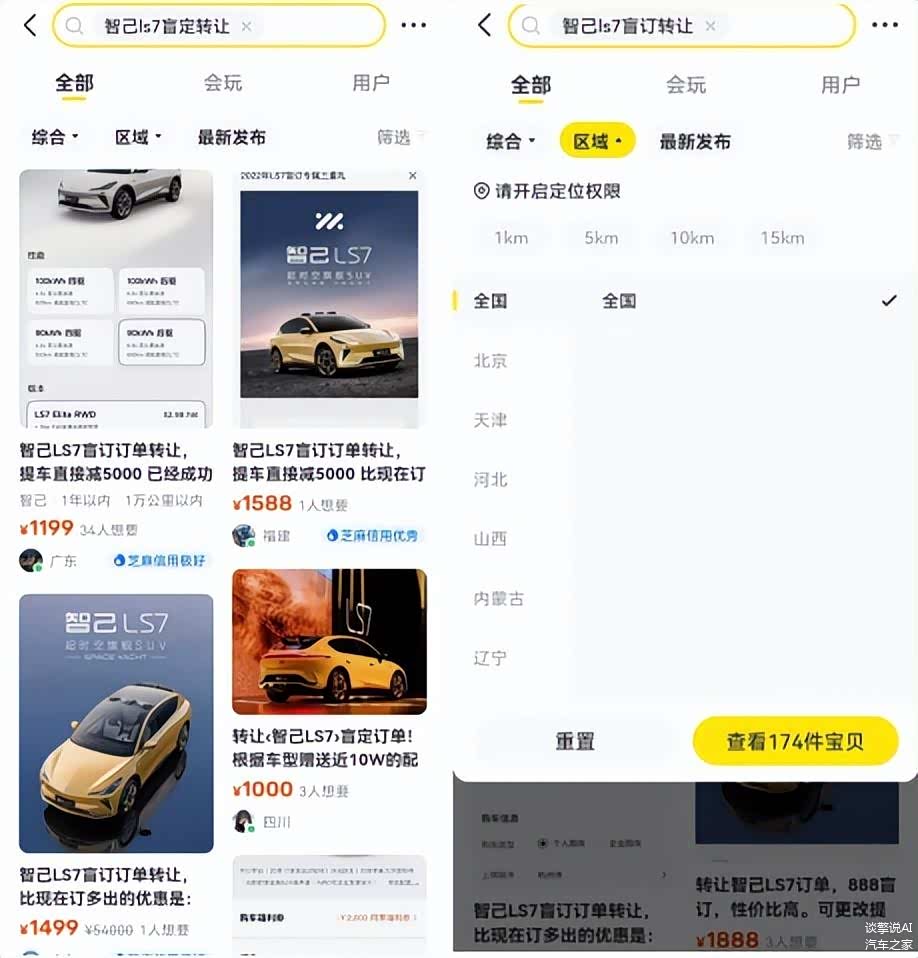 近日,据多家媒体爆料,闲鱼平台出现大量 智己LS7(图片 | 参数 | 询价)盲订订单转让的消息。谈擎说AI尝试搜索了“智己LS7盲订转让”,结果显示,转让信息来自广东、浙江、湖南、上海等不同地区,全国范围内共有“174件宝贝”。