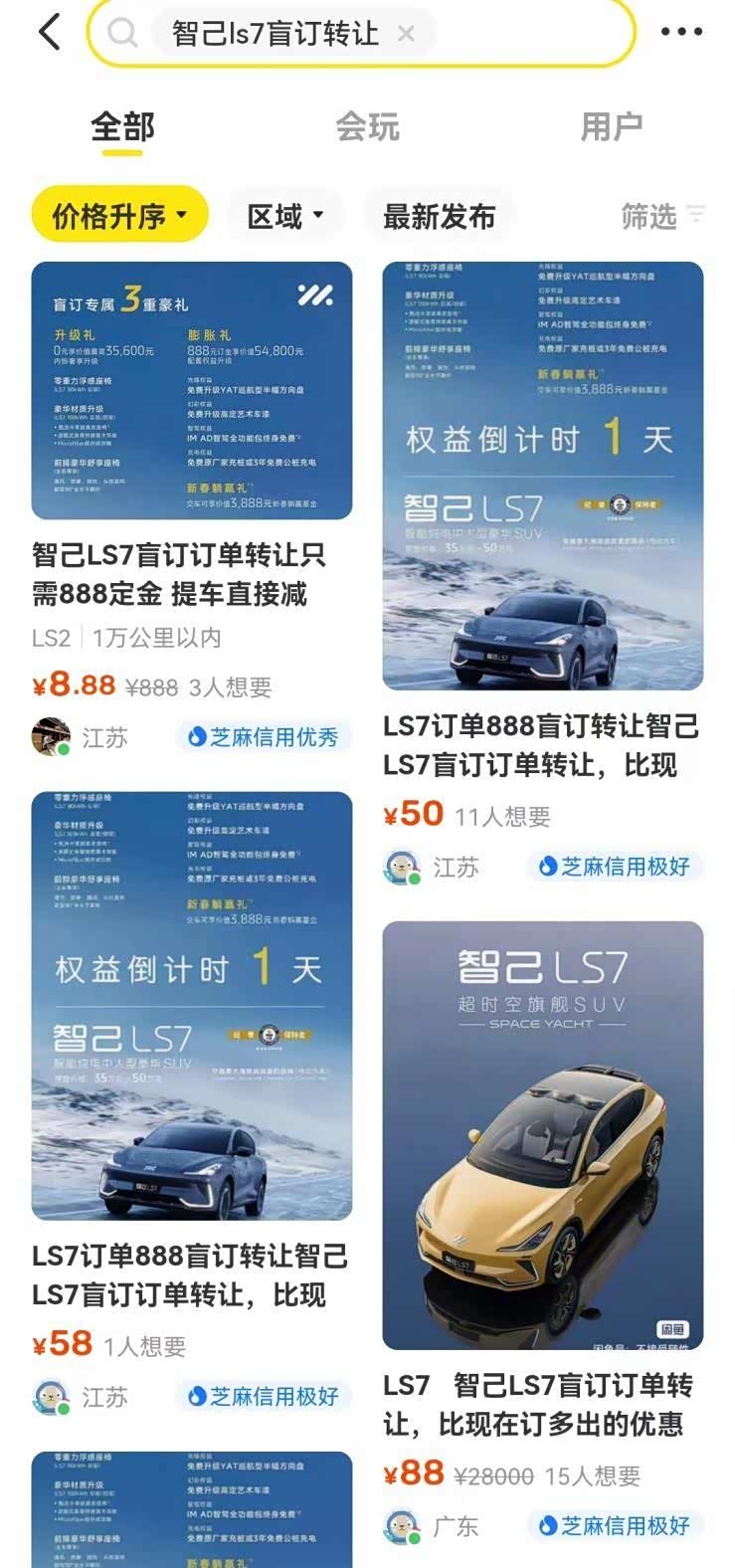 从智己LS7盲订转让者给出的标价来看,的确有少部分卖家给出的价格低于官方的888元盲订金额。如果这些个订单来自黄牛,这单生意妥妥是赔了。