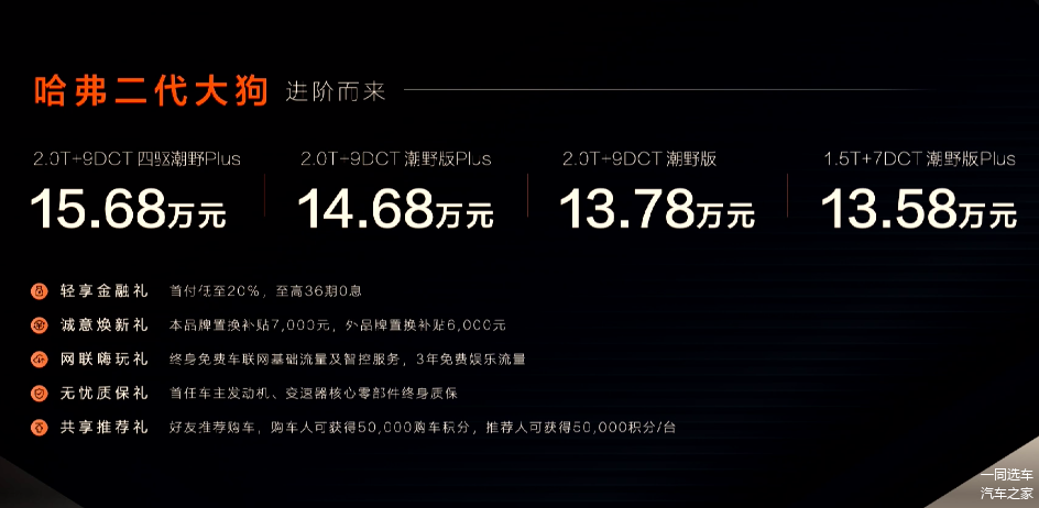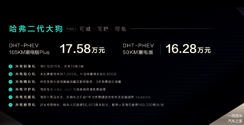 2月27日, 哈弗二代大狗(图片 | 参数 | 询价)正式上市,两款插电混动车型指导价分别为:16.28万元、17.58万元。1.5T、2.0T燃油版指导价:13.58-15.68万元。